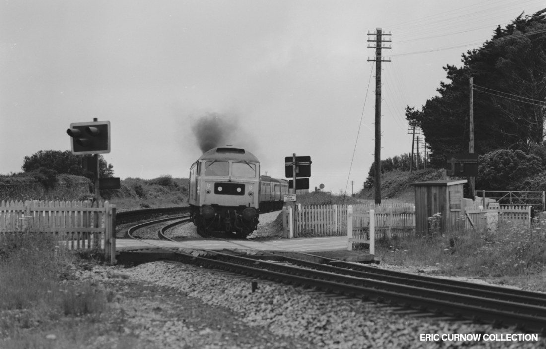 With sirens now muted but red lights still flashing, a Class 47 diesel with a domino glass headcode releases itself from the speed restriction on the curve at Gwinear Road level crossing and opens up towards Penzance in 1980. 8001#AI01-GWI-47###-PAS_D