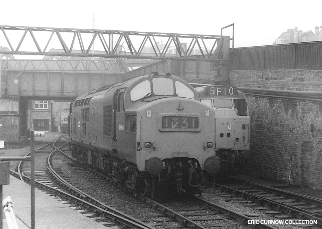 A view still common enough on my early visits to Liverpool shows 6968 and 5577, with a class 47 in the background, parked in the station sidings on 25th November 1972. Beside the locos is the slip road mainly used by taxis from the station, behind the photographer, and with the exception of this road, all is totally different today – entombed under office blocks. 721125A01-LST-d6968-PARKD