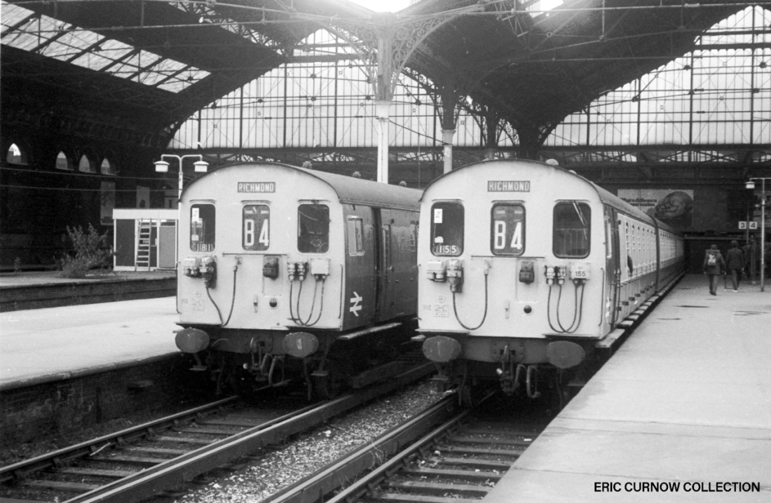In the final period before demolition, 501181 and 155 wait at Broad Street station; the roof being just the remnant of a once extensive canopy that spread further over the platforms. 181 on the left unit is in blue-sided livery and beside it 155 in blue and grey. The third rail seemed very strange to me – as I always associated it with the Southern Region – south, and not north, of the City. 840714A01-BST-U501#-PAS_D