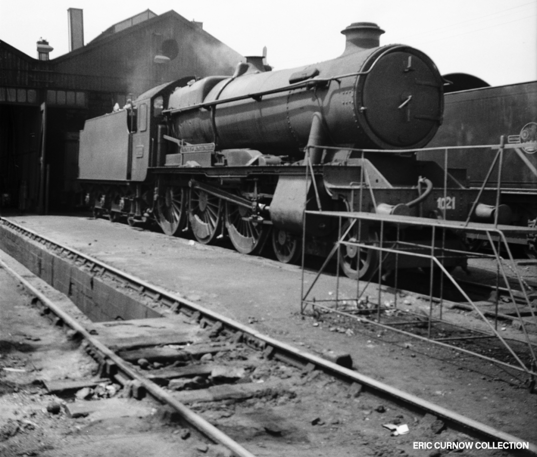 1019 ‘COUNTY OF MERIONETH’ sits on Long Rock depot’s turntable with, around it, the ribbed apron used for pushing the assembly. To the left is the air raid shelter, a breakdown van and coal wagons, and to the right, the main line. Copyright: R.S. Carpenter. 500627A01-LRK-s1019-TURNT
