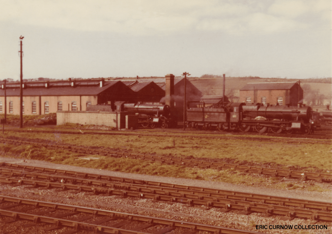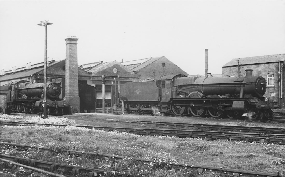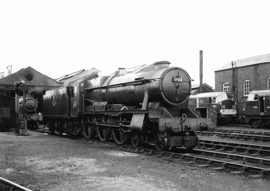 1008 “COUNTY OF CARDIGAN” waits outside Penzance (Long Rock) shed in the company of 6921 “BORWICK HALL”, D6341 and D838 “RAPID”. Steam was confined to the two-road shed on the left at this time, and the diesels to the right; its facade brickwork recently repaired. Copyright: Paul Sankey. 620611A01-LRK-s1008-PARKD