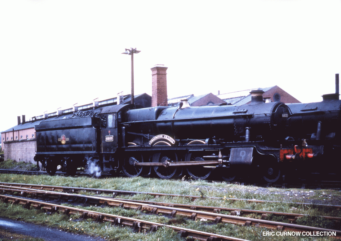 6805 “BROUGHTON GRANGE” sparkles in the sun before the sheds at Long Rock depot, ready for service. Penzance had a reputation at this period for well-finished locomotives, and the up Cornish Riviera Express usually had a buffed-up ‘Castle ‘ at its head – it was even said a withdrawn Grange was cleaned up to this standard even though it was withdrawn and destined for scrap. 6####IY21-LRK=s6805-PARKD