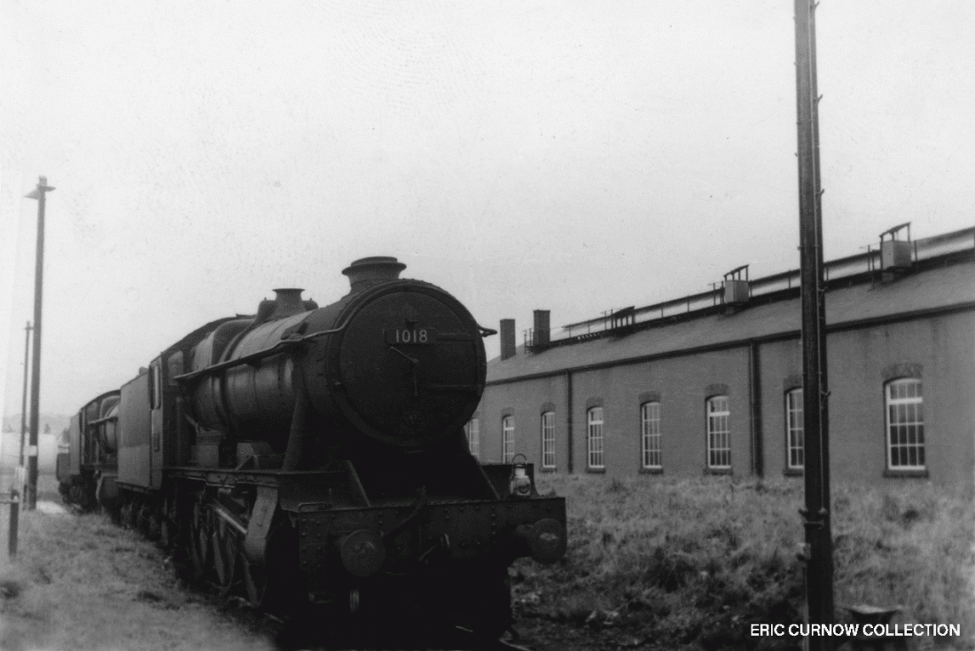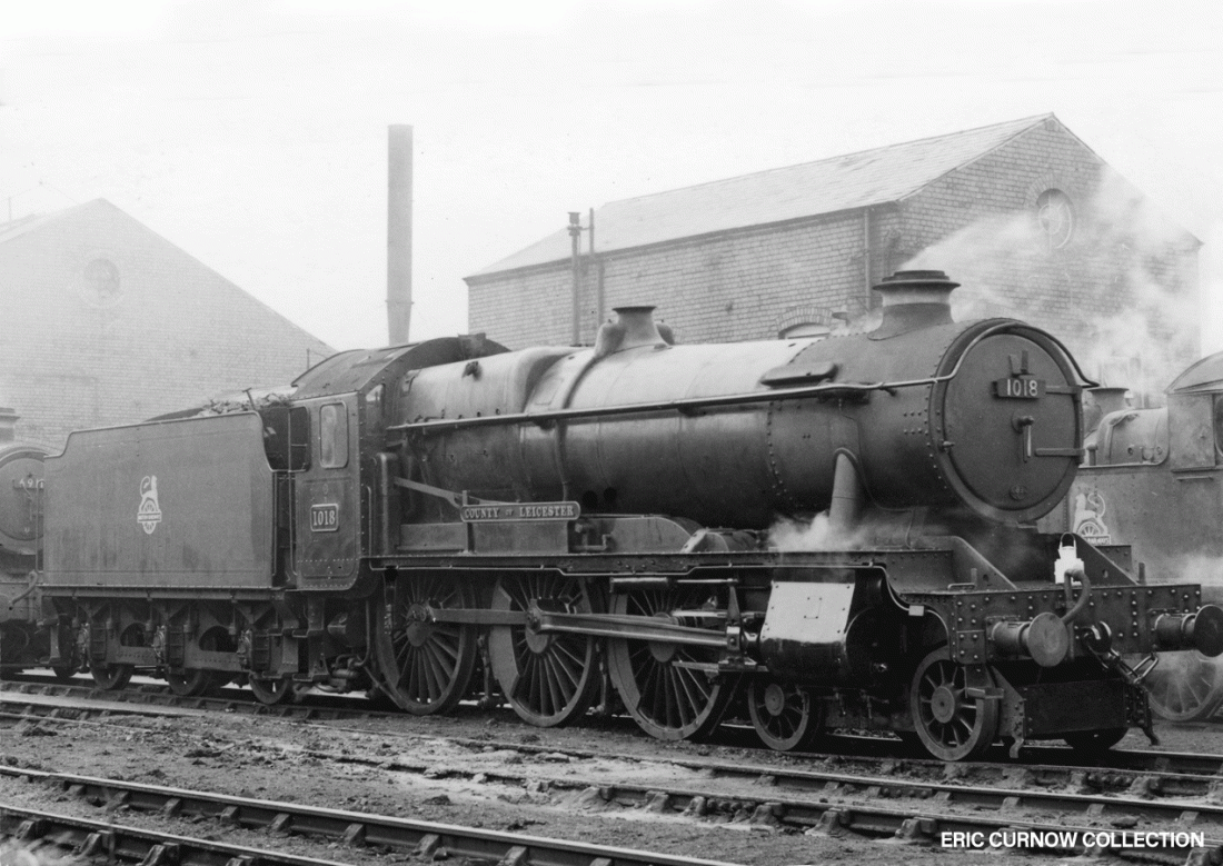 Locos including 1018 ‘COUNTY OF LEICESTER’ stand on Long Rock depot on 20th May 1957 wearing the early BR logo on their sides. The County’s nameplates seemed less graceful by not following the splasher curves. Photo: L.W.Perkins. 57052CO01-LRK-s1018-PARKD