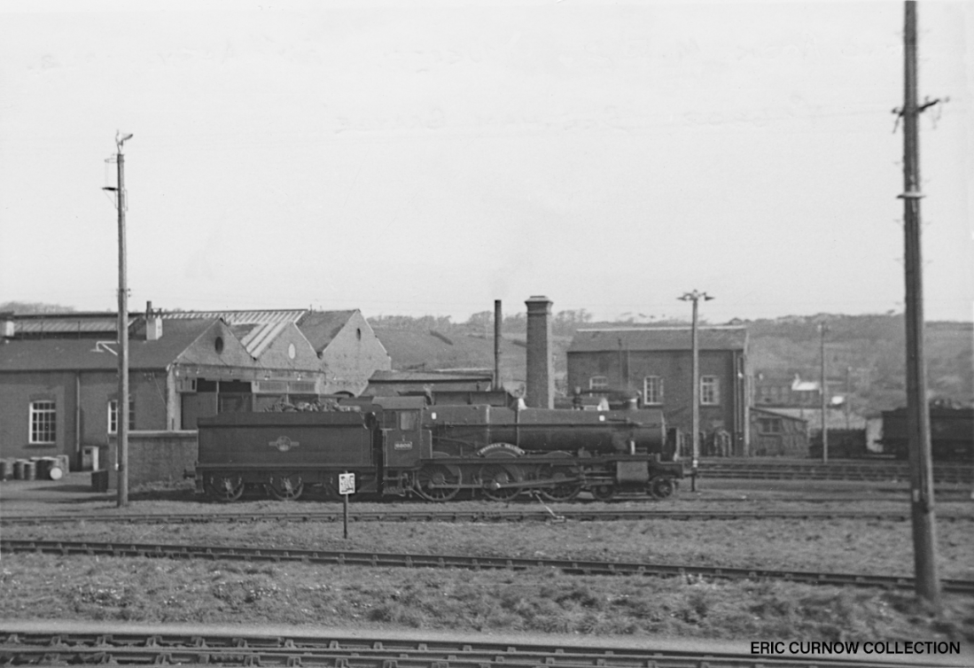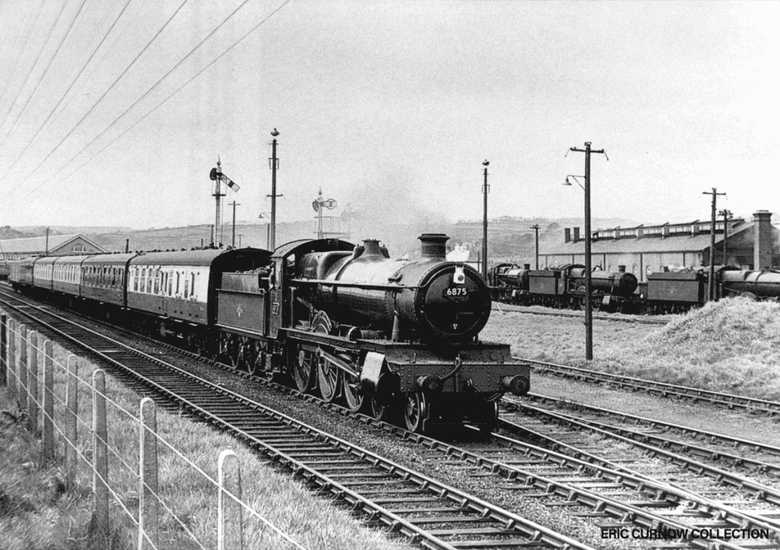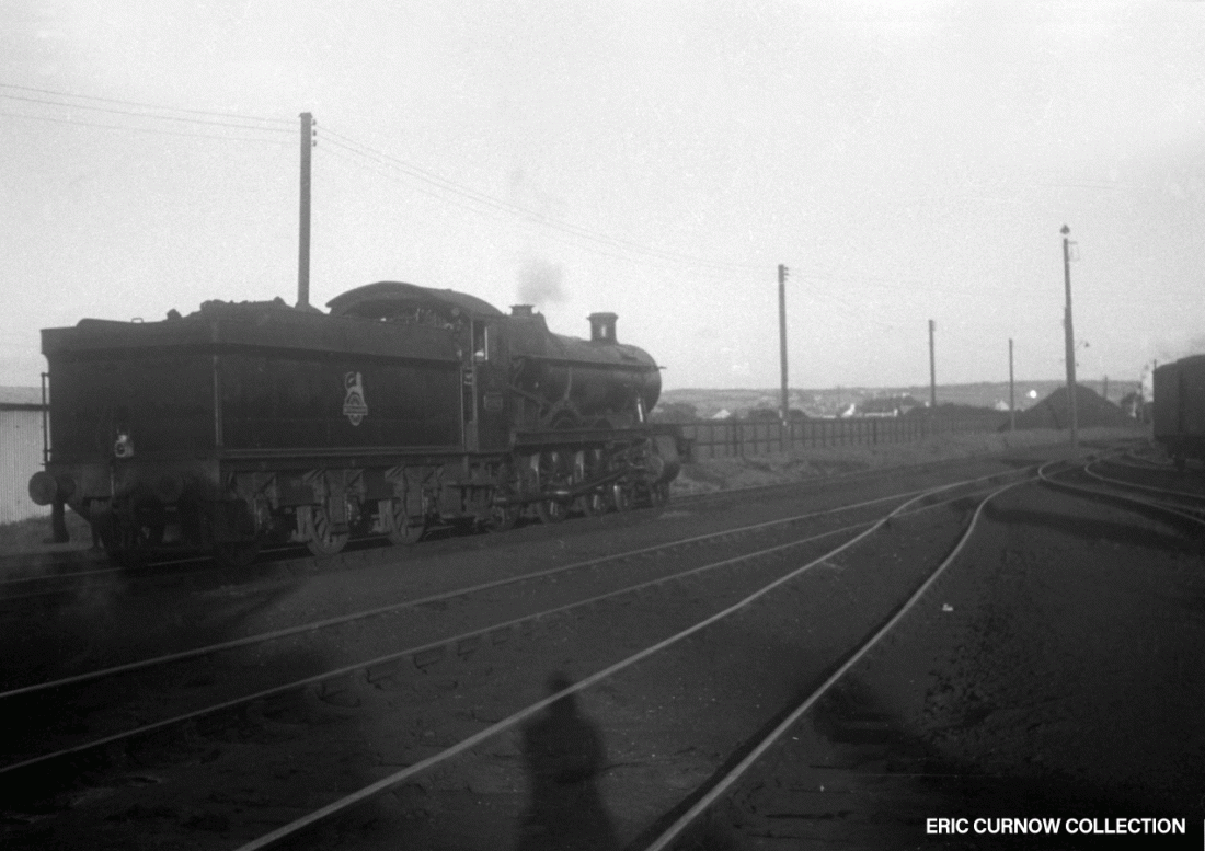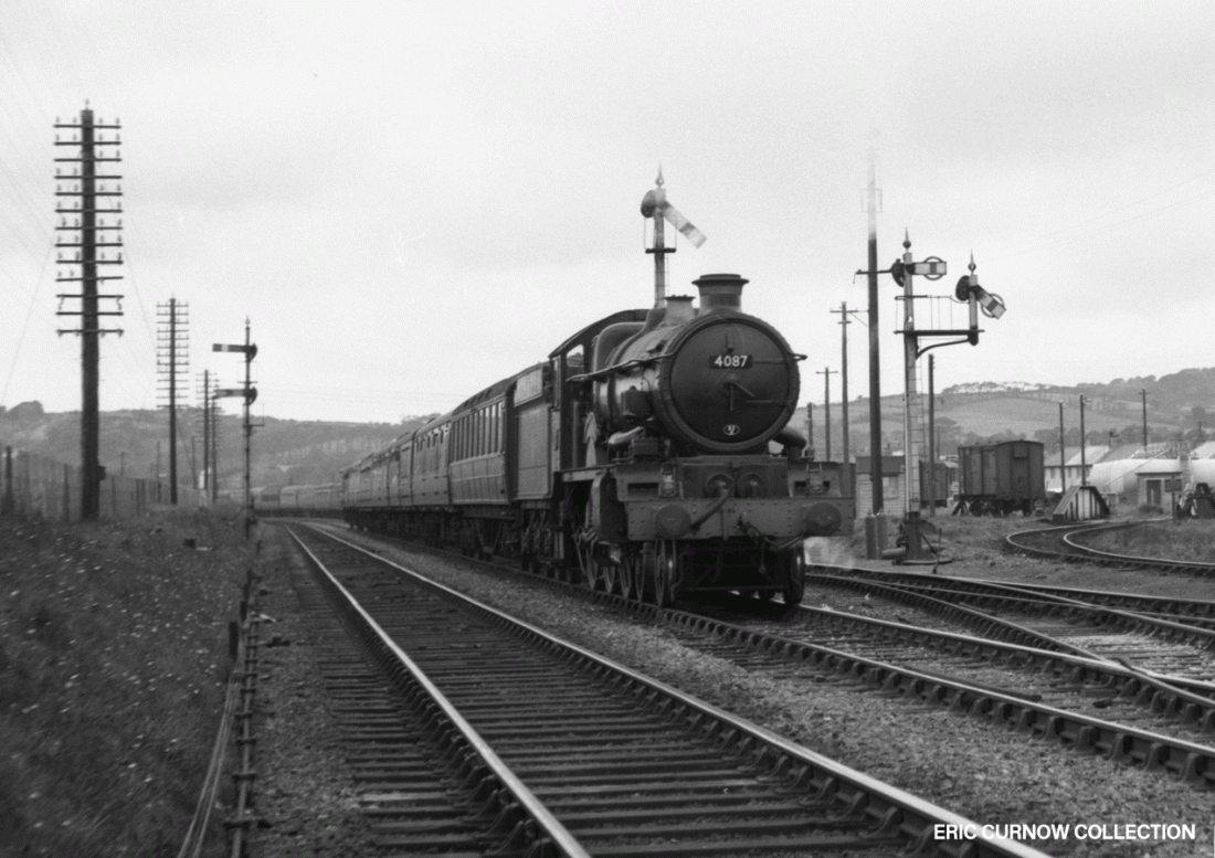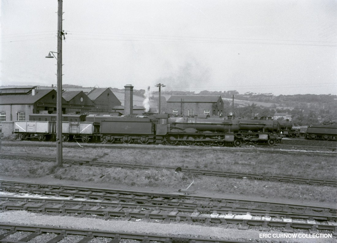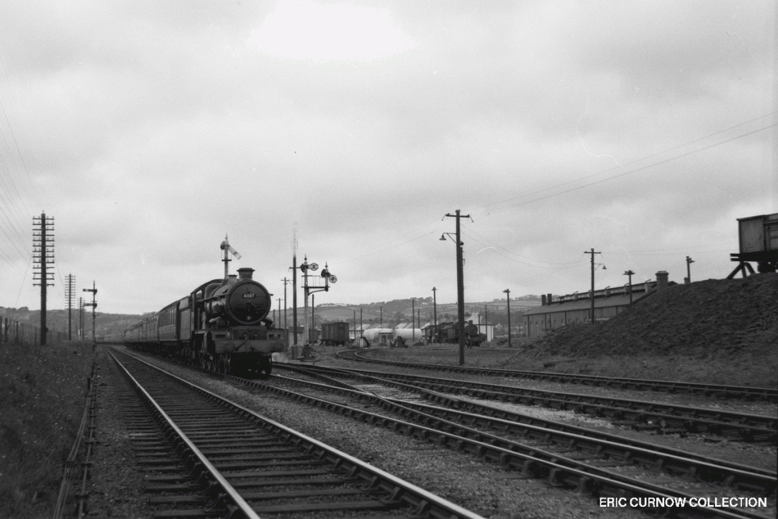 Top link haulage for an up service consists of immaculate 4087 “CARDIGAN CASTLE”, passing Long Rock with locos steaming on shed. The white objects are new diesel fuel tanks, showing that preparation for dieselisation had seriously started. 56###AC01-LRK-s4087-PAS_U