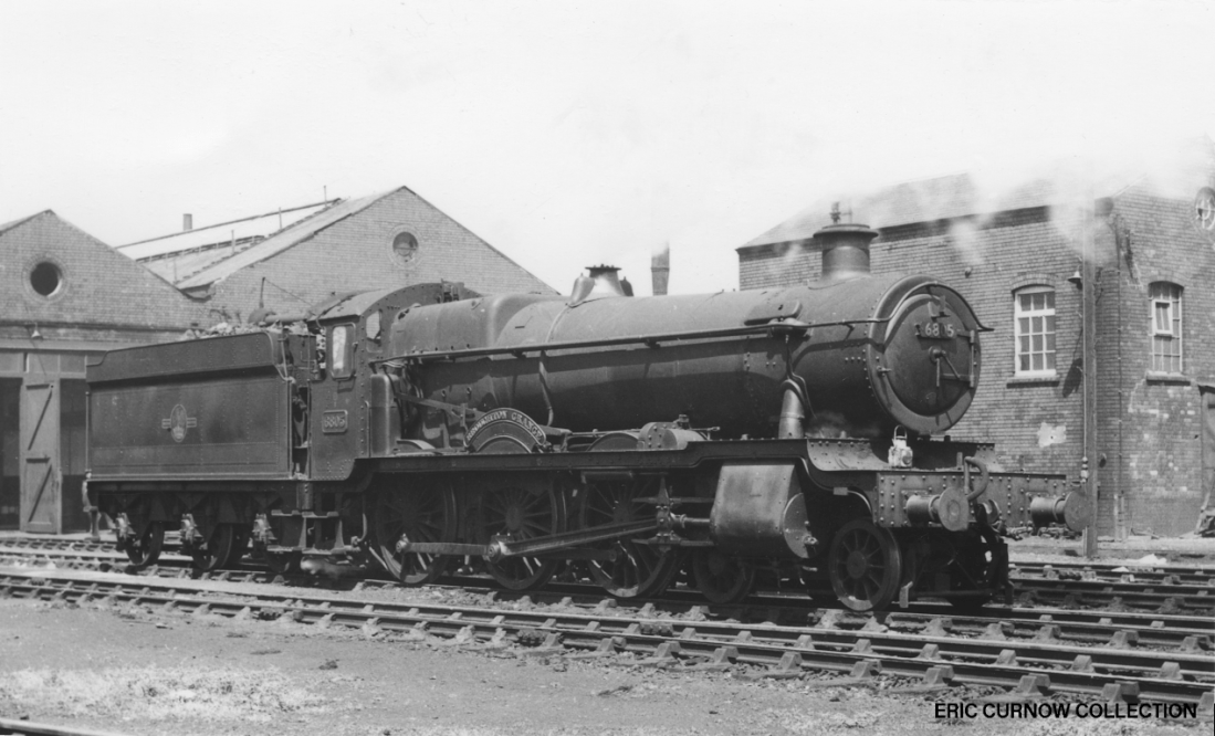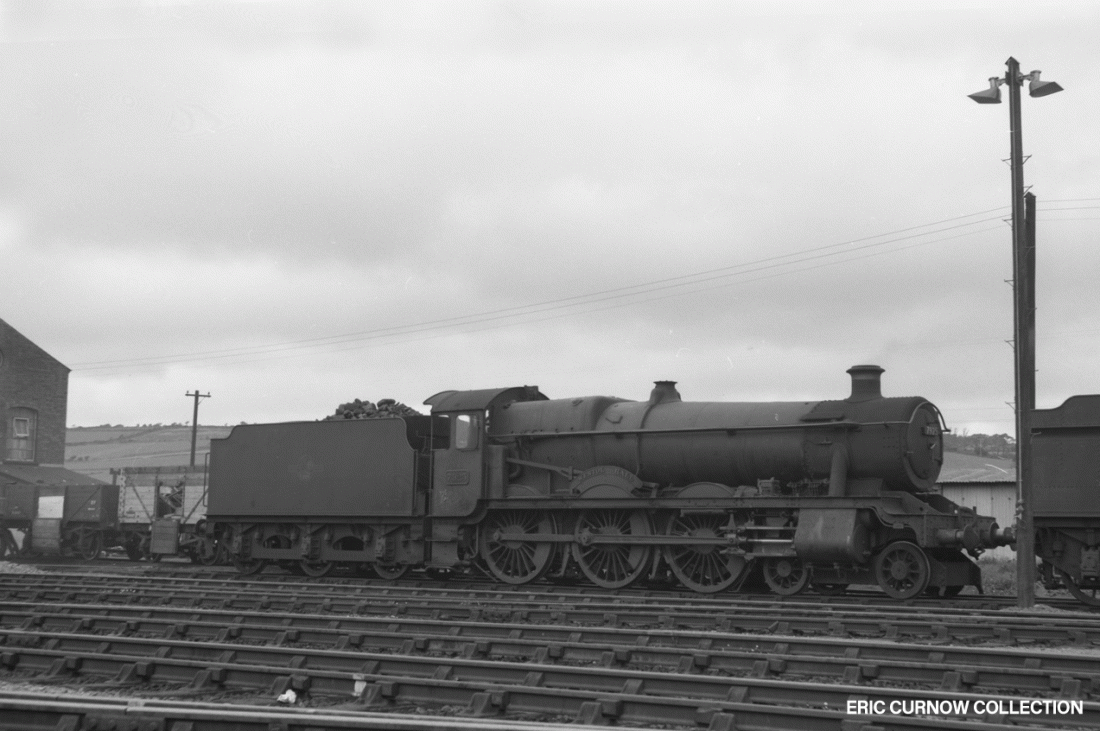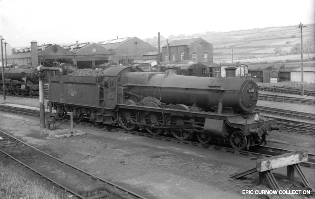 6938 “CORNDEAN HALL” is on shed at Penzance MPD in the early 1960s, as not only is there an 0-6-0 diesel shunter present, but also two D63XXs. A grounded van is sat at the entrance to the depot to provide more storage, and the site is crowded with locos. White ventilation chimneys plus two darker ones are still intact on the shed’s roofline. 6####IB01-LRK-s6938-PARKD