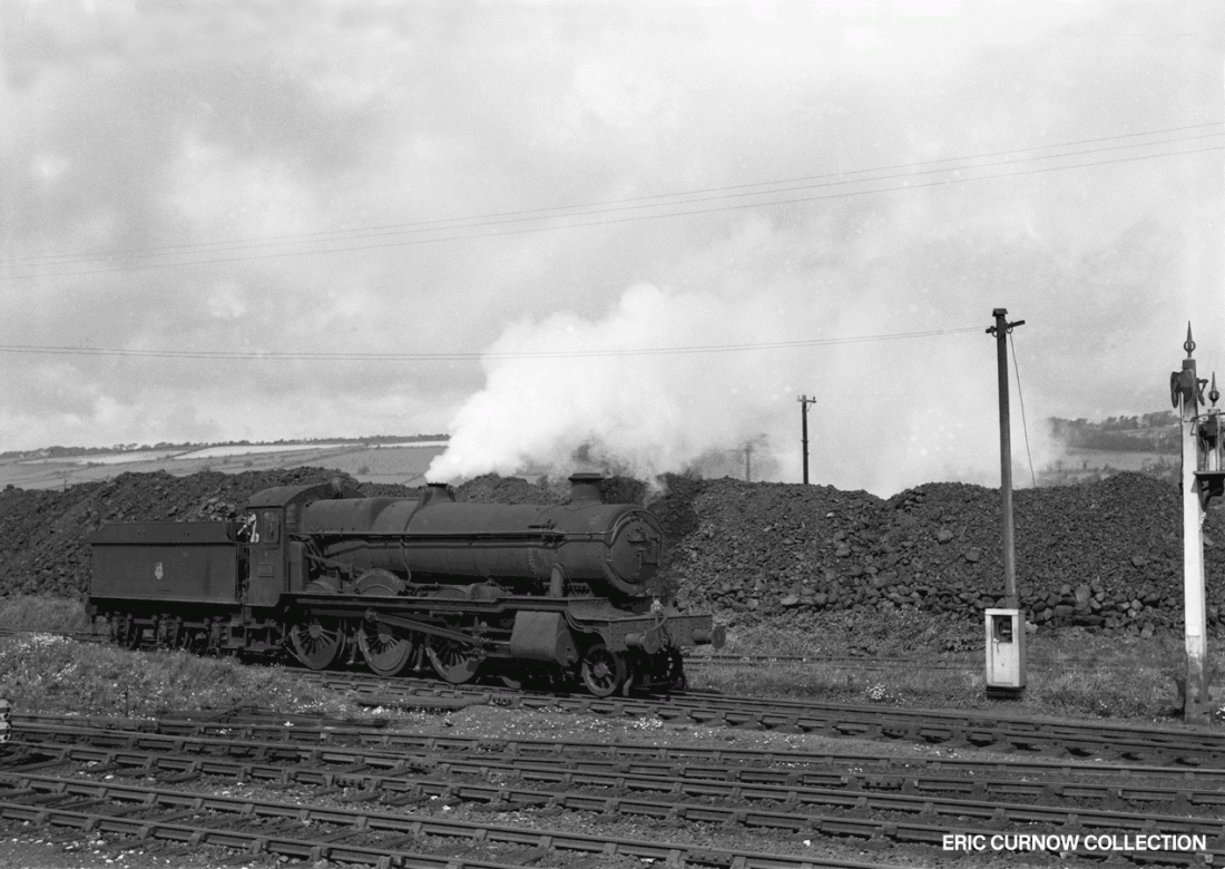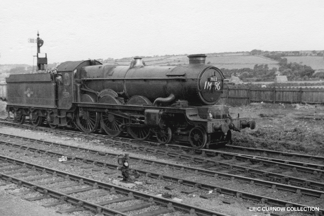 Bearing a handwritten service number on its smokebox door, 7022 “HEREFORD CASTLE’ moves off Long Rock shed towards the crossing to take the 10:50am Penzance to Manchester. The sidings behind it already show signs of dereliction. 600716A01-LRK-s7022-LIG_D