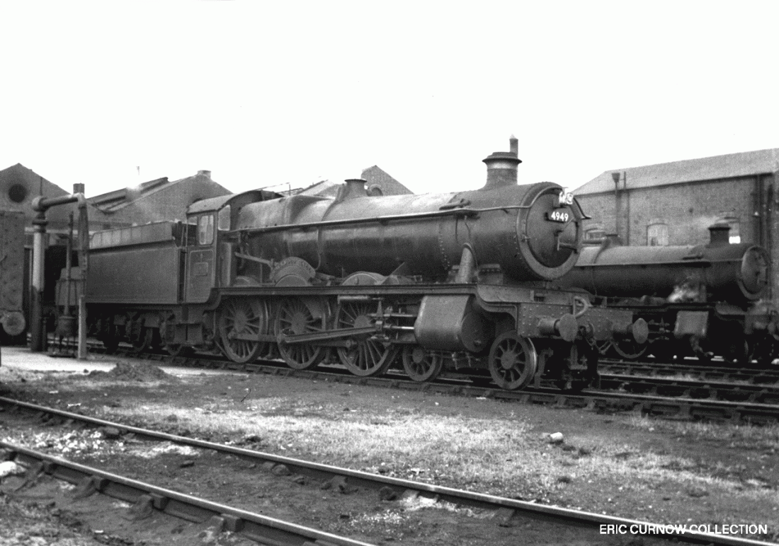 An unmanned 4949 “PACKWOOD HALL” and a classmate without numberplate, gently smoke with their noses pointing east on Long Rock depot. The water column beside the locomotive has a ‘fire devil’ below it to help prevent icing up in cold weather. 57###AA01-LRK-s4949-PARKD
