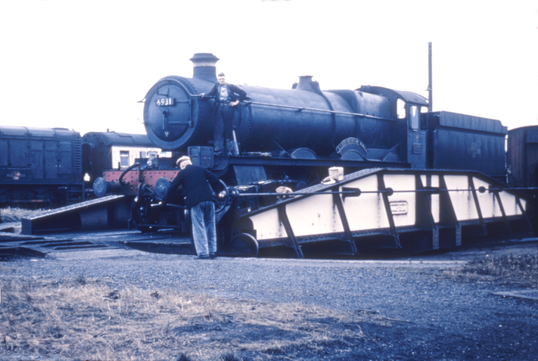 On a dull day in the early 60s, a young man with greasy hands and soiled trousers is aboard 6931 “ALDBOROUGH HALL” at Long Rock Shed while a companion leans to turn the loco. The turntable is in fine external order, and an array of interesting boxes line one retaining wall and the loco’s buffer beam. In the background is a green diesel shunter and ex-GWR-era carriage. 6####IS01-LRK-s6931-T_TBL