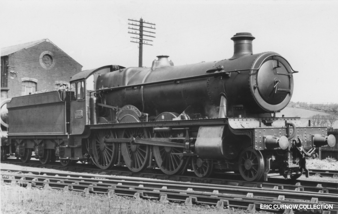 With sides oiled down and brasswork gleaming, 6800 “ARLINGTON GRANGE’ waits top link duty on the siding at Long Rock depot. Behind the engine is the Air Raid shelter, and on the roof line of the sheds the chimneys and glazing seem to have been cleaned, had attention or been replaced. 610426A01-LRK-s6800-PARKD