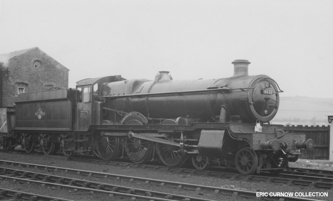 A mist drifts over 6837 ‘NORTHAMPTON GRANGE’, in A1 condition, parked before the commonly positioned mineral wagon on the Firring Bay road at its home Long Rock depot of 83G, as displayed by the oval shed plate on its front end. The wooden palisade fence is clearly discernable before it with the edge of the stores building to the right, but the hillside beyond is indestinct. 6####IY18-LRK=s6837-PARKD