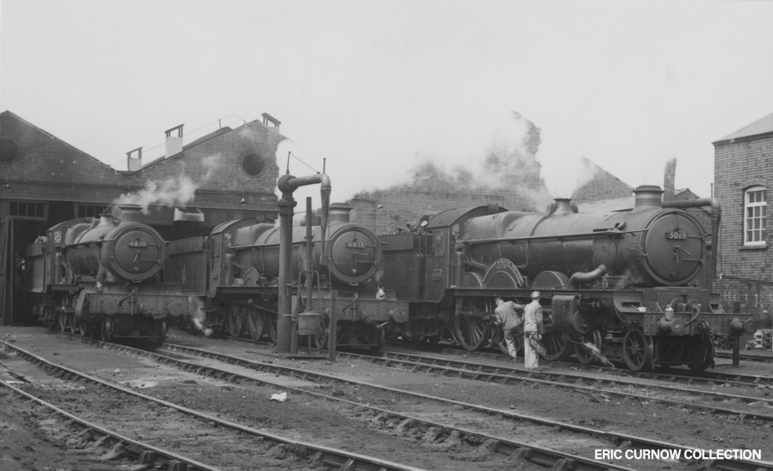 In this sharp and carefully composed picture, a locoman kicks the motion of Castle 5069 “ISAMBARD KINGDOM BRUNEL” as his colleague with him watches with a ‘NOT TO BE MOVED’ sign in his hand. Beside them are 6830 “BUCKINHILL GRANGE” and 6931 “ALDBOROUGH HALL” – the three locos’ steam hiding the depot building behind them. Copyright: J H Aston. 6####IY22-LRK=sLCOS-PARKD