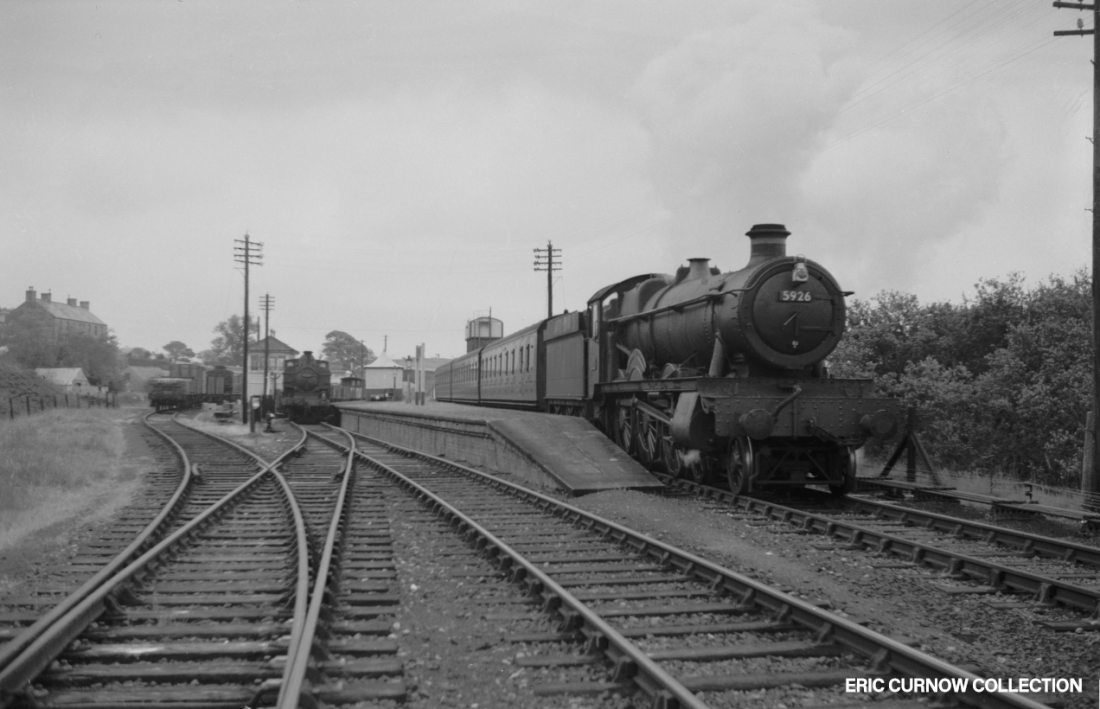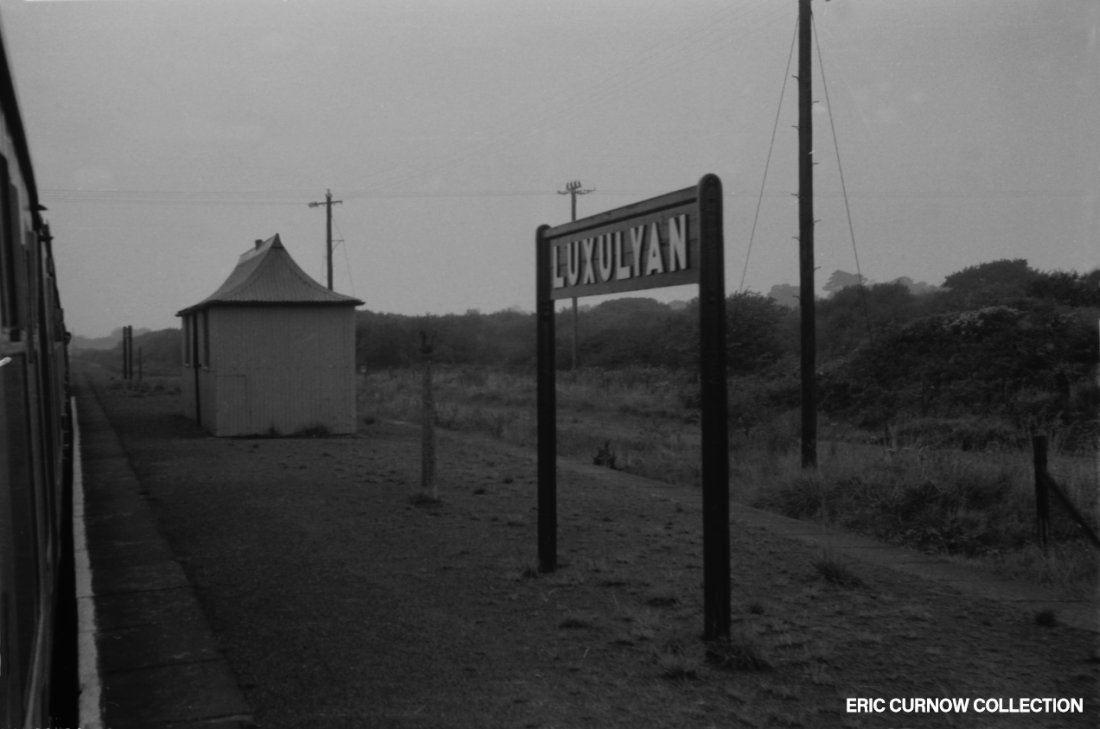 What a rich contrast with its spartan condition today! Luxulyan Station on the Newquay Branch in 1960 features two sidings, a Camping Coach, the Signal Box, a short freight headed by an 0-6-0 Pannier Tank, platform and Pagoda Shelter, with a Water Tower on the opposite side of the image. Between them is 5926 “GROTRIAN HALL” on a three-coach Newquay Service. 600617A01-LUX-s5926-PAS_O