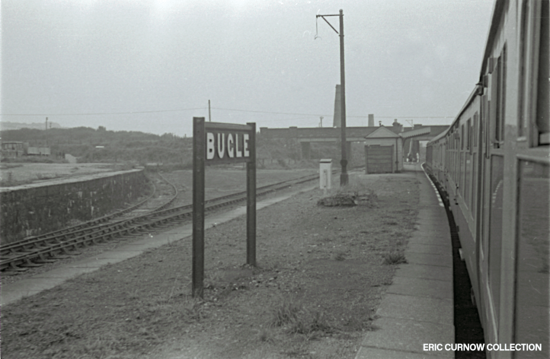 A Newquay-bound train of Mk1 coaches pauses at Bugle on the Newquay branch in August 1973, reminding me of a visit to the village with Penzance AFC in the years I followed the football club. The running in board has the distinctive ‘G’ of its GWR origin, suspended between two pieces of old rail. The loading bank to the left of the photo was a distinctive memory too. 7308##A01-BGL-STATN-VI_NW