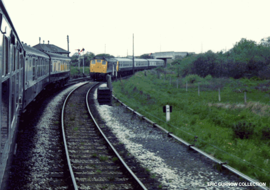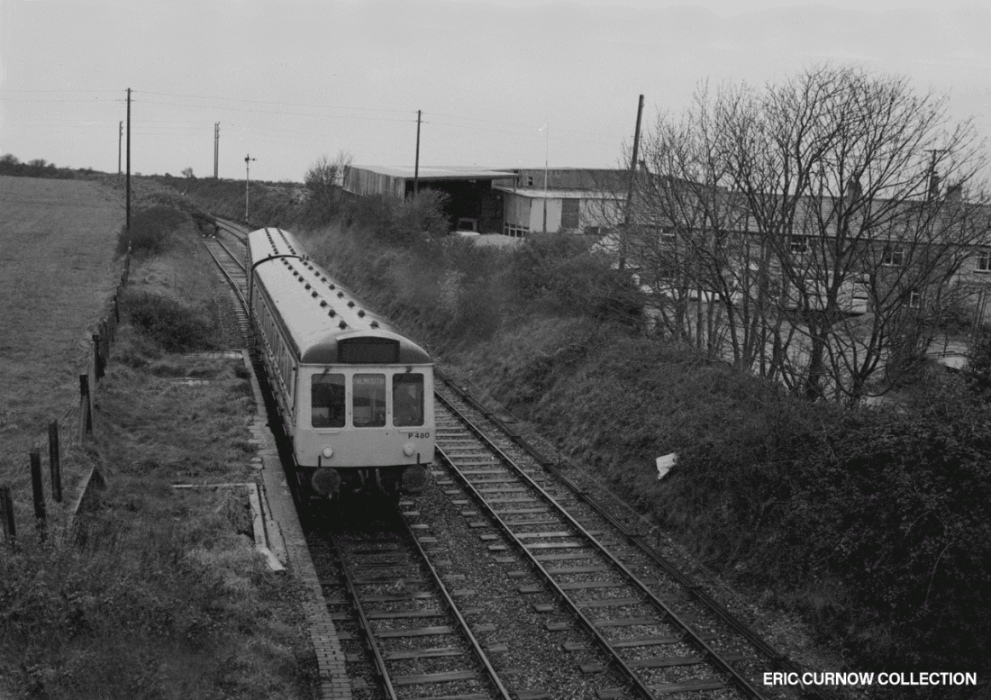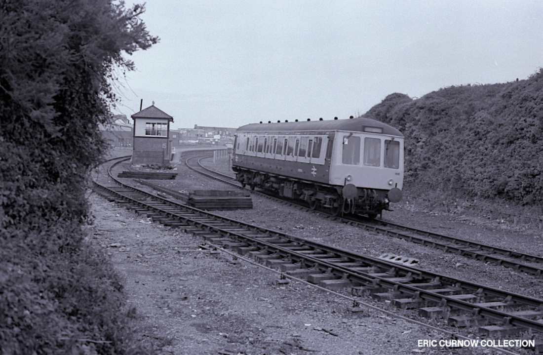 Seen from the A30 road bridge northwestwards, 2-car DMU set P480 crosses from double to single track, passing a short platform still just showing the foundations of a water tower. The closest cab rather inappropriately still has ‘FALMOUTH’ wound up in its destination blind! 841121A01-SDJ-DMUX2-PAS_O