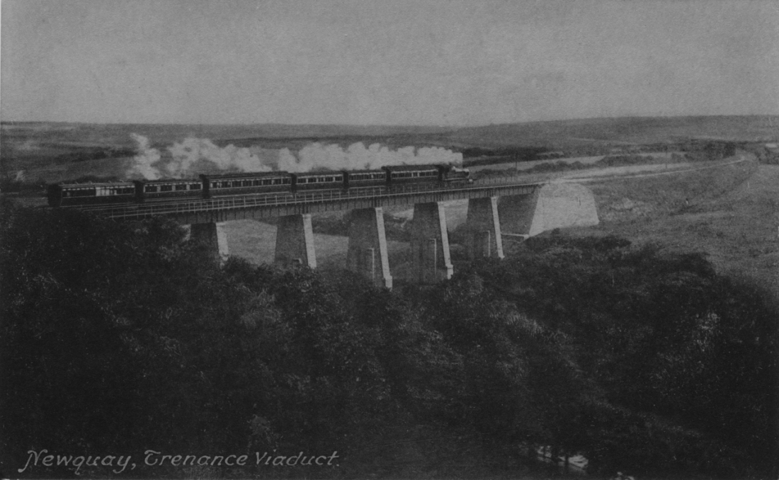 This early 1900s sepia tinted postcard image shows a Newquay-bound train crossing Trenance Viaduct of an earlier form than the current masonery one, in an otherwise undeveloped landscape and with fairly unusual widely-splayed piers under the girder beams.I have seen images of this view cropped differently in various printings. #####AA01-NQY-VIADT-VI_NW