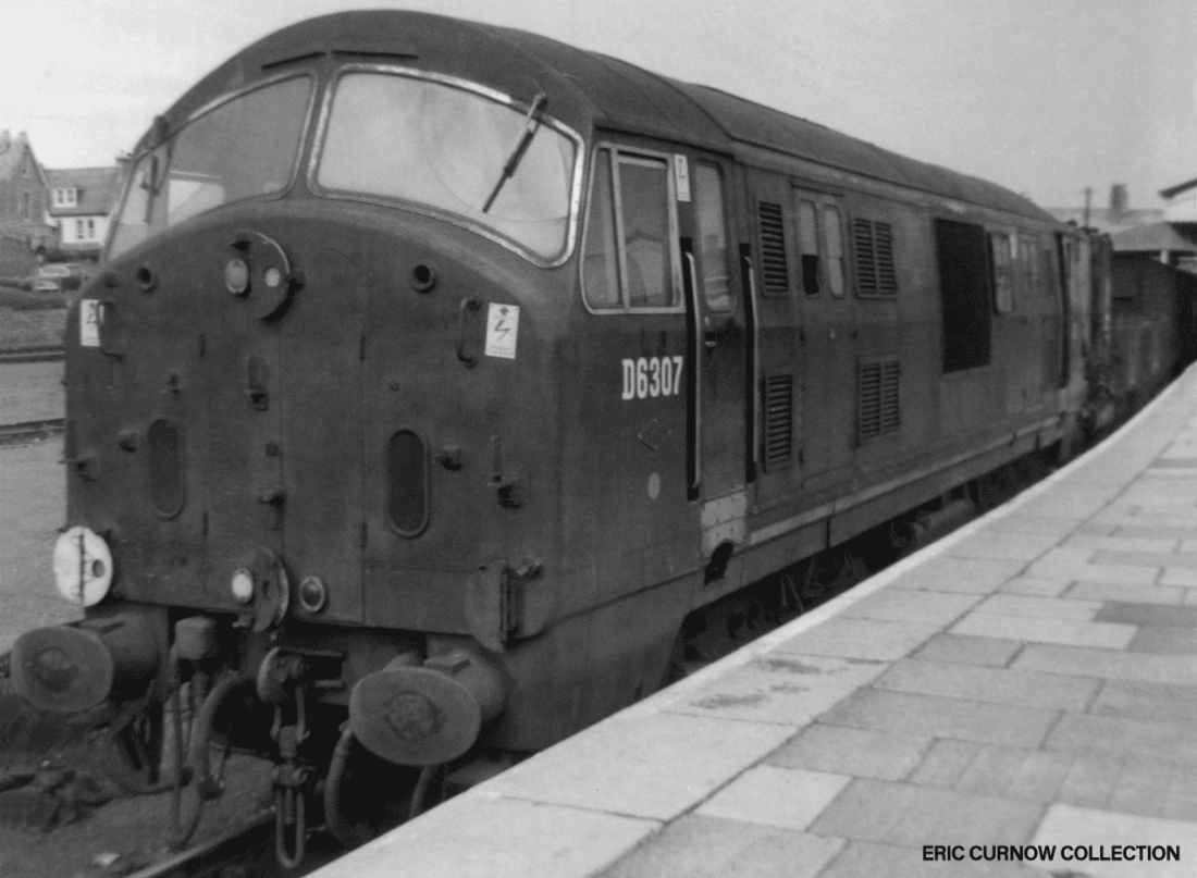 D6307 heads a freight at Newquay Station on 21st August 1963. It has still to receive a warning panel, though overhead wires signs are fitted. As the first of the production run, it has a grating instead of louvres centrally on the bodyside to optimise ventilation. 630821A01-NQY-D6307-PAS_I