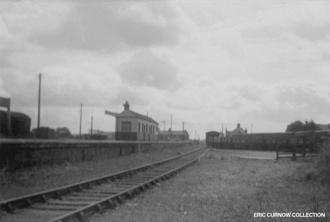 Bugle Station, facing north east, is viewed from the end of the island platform. To the left against the loading stage are a rake of wagons and a van – the stage being the most significant structure I remember from my first visit other than the platform and bridge. 65###AB02-BGL-STATN-VI_NE