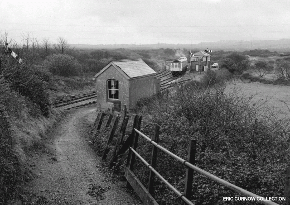 Seen from the slip road to the A30 crossing Goss Moor, a three car DMU powers away from St Dennis Junction Signal Box. Fencing of old rail flanks one side of the track, leading to a lineside staff mess building and store with lean-to toilet on the far side. 841121A01-SDJ-BLDNG-PAS_O