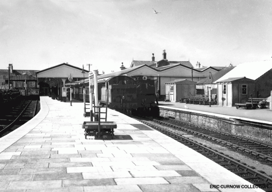 A single-car DMU in green with small warning panel sits ready to leave at Newquay Station in 1965. The crossover to release locos from platform 2 is clearly seen beside the unit, and the scene is full of barrows, trolleys and seating. The goods yard once to the left of the platforms is now a car park. 65###AJ01-NQY-STATN-VI__N