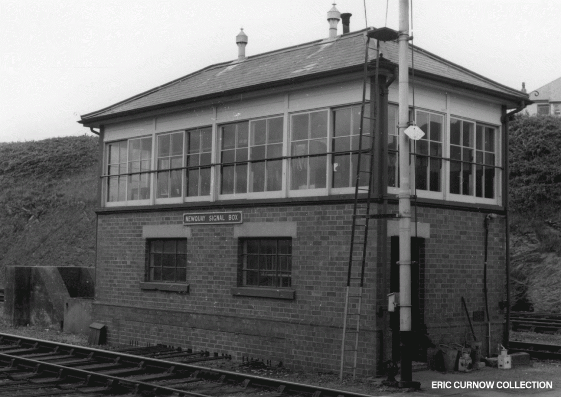 Newquay Signal Box in the 1960s, kept in very good order. It is protected by a very substantial concrete “buffers” at its southern end, and, opposite, the stark white hexagonal track circuit sign indicates the presence of the most useful signalling safety feature developed. 6####GH01-NQY-SIG_B-VI__S