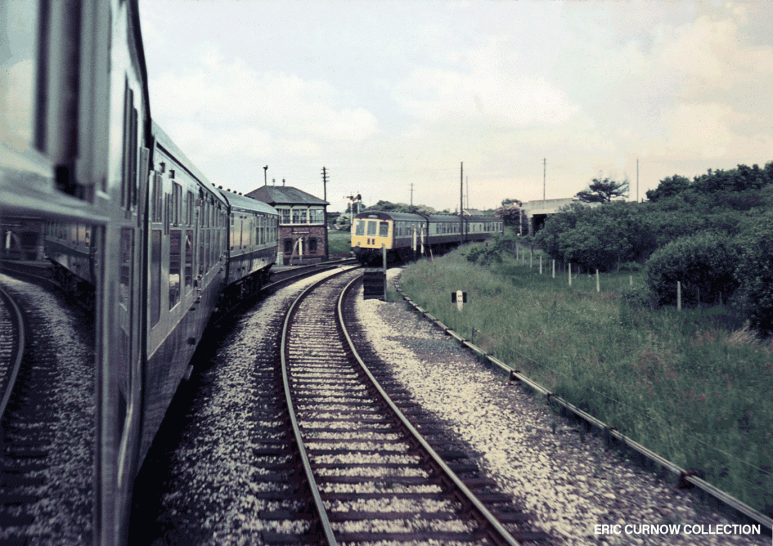 Single-line working on the Newquay branch required passing points – particularly at points like St Dennis Junction where china clay lines joined, too. In 1971, an outgoing 3-car DMU gets a clear road now the inbound service has reached double track again. 710616A01-SDJ-DMUX3-PAS_I