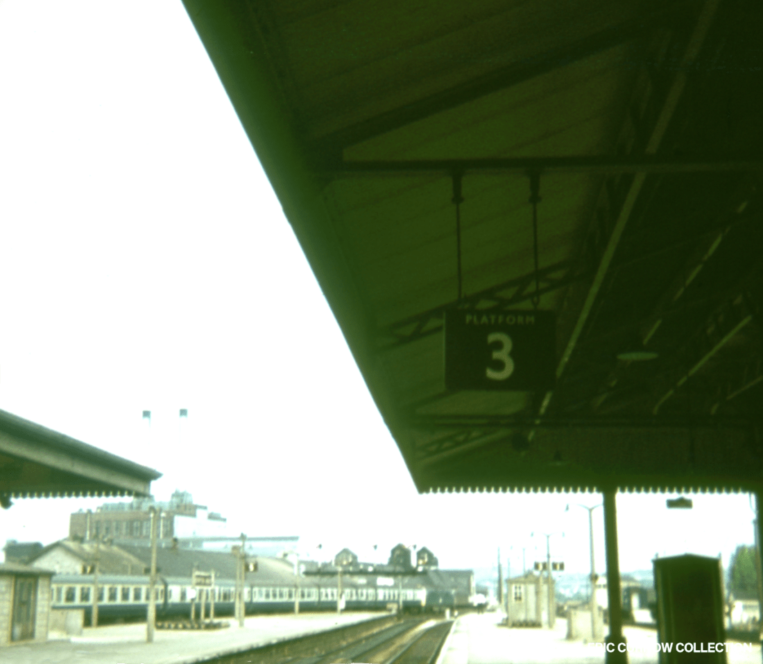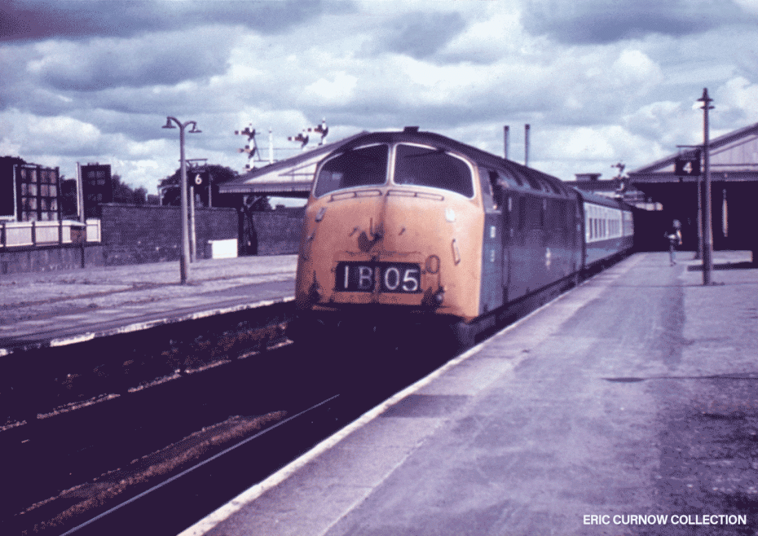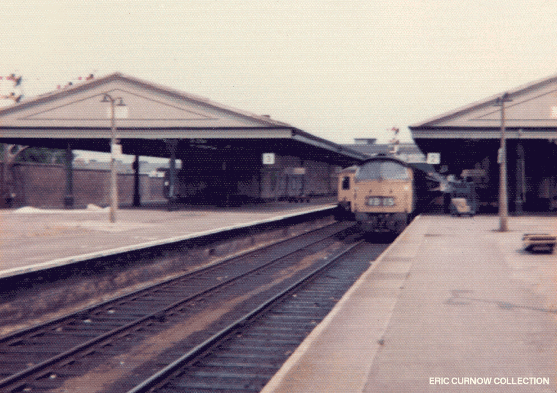 A ‘Warship’ class diesel pulls away eastwards from Newton Abbot with a passenger service of Mk1 stock, viewed from under the awning of the main down platform. The station still has its maroon and cream signage including the GWR wooden running-in board. Taken in the early 1970s, partially visible is the soon-to-be-demolished coal-fired power station. 7####GT02-NTA-PLTFM-VI_NE