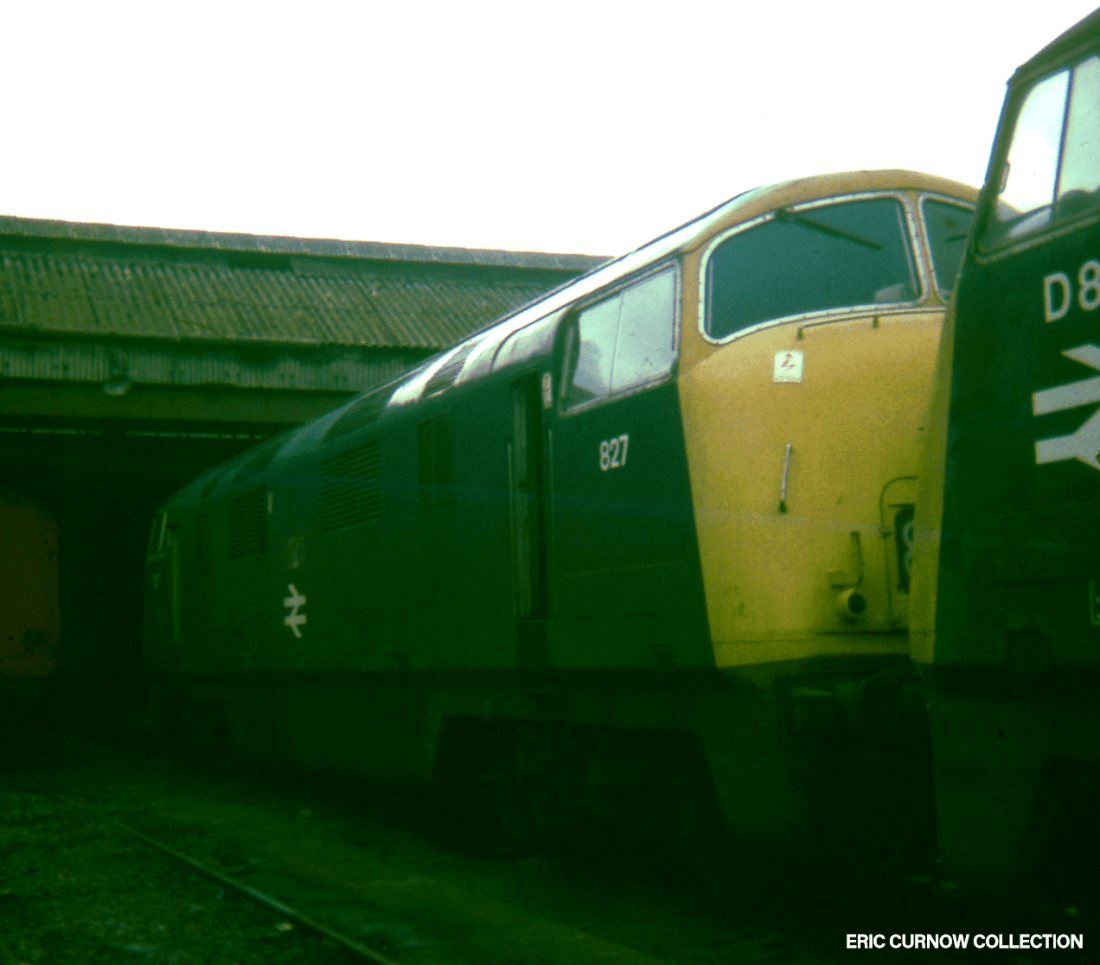 827 “KELLY” is withdrawn, stored, at the back of Newton Abbot depot, with its nameplate missing, and in the company of another Class 42 engine. “KELLY”, like a cluster of those numerically before and after it, was a frequent visitor to Penzance, and memorably to my recollection paired with “JUPITER” or “INTREPID” on various different occasions. 7####GT05-NTA-d827-PARKD