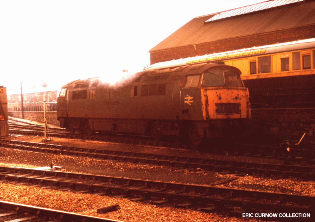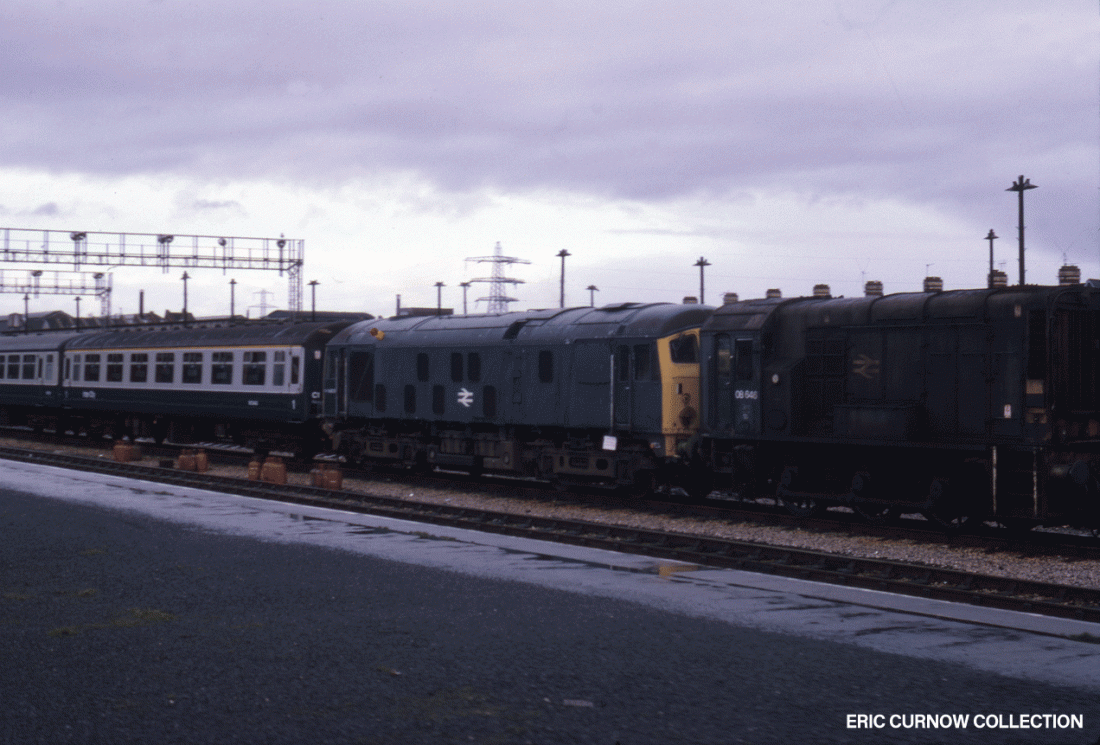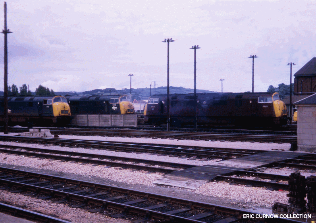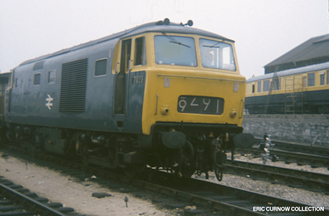 With its ‘D’ prefix painted-out, and in very reasonable external condition, D7028 is parked with a brake van on a siding parallel to the station platforms of Newton Abbot station. Behind it are the GWR ‘Ocean’ coaches preserved by publishers ‘David & Charles”- ‘Centenary’ stock from the Cornish Riviera Express, that were a welcome landmark here for many years. 7####GS01-NTA-D7028-PARKD