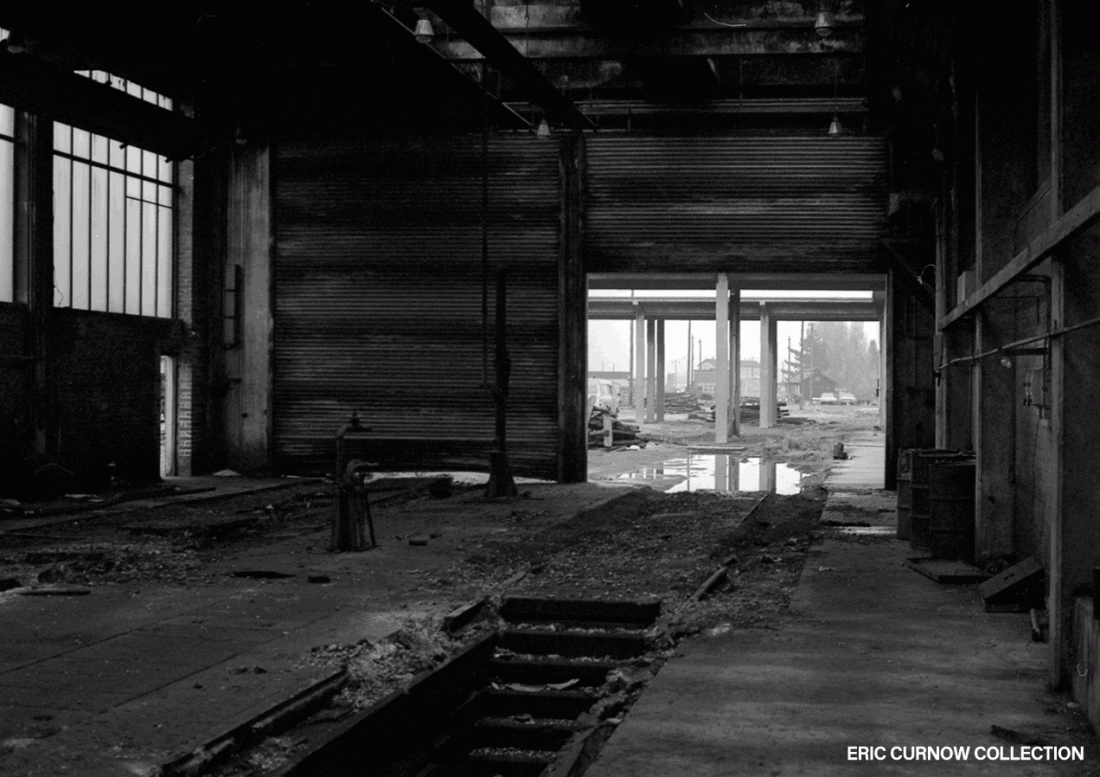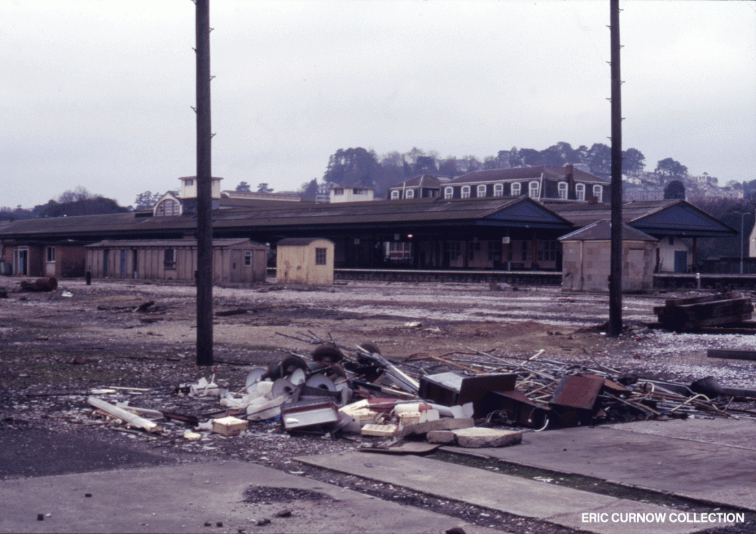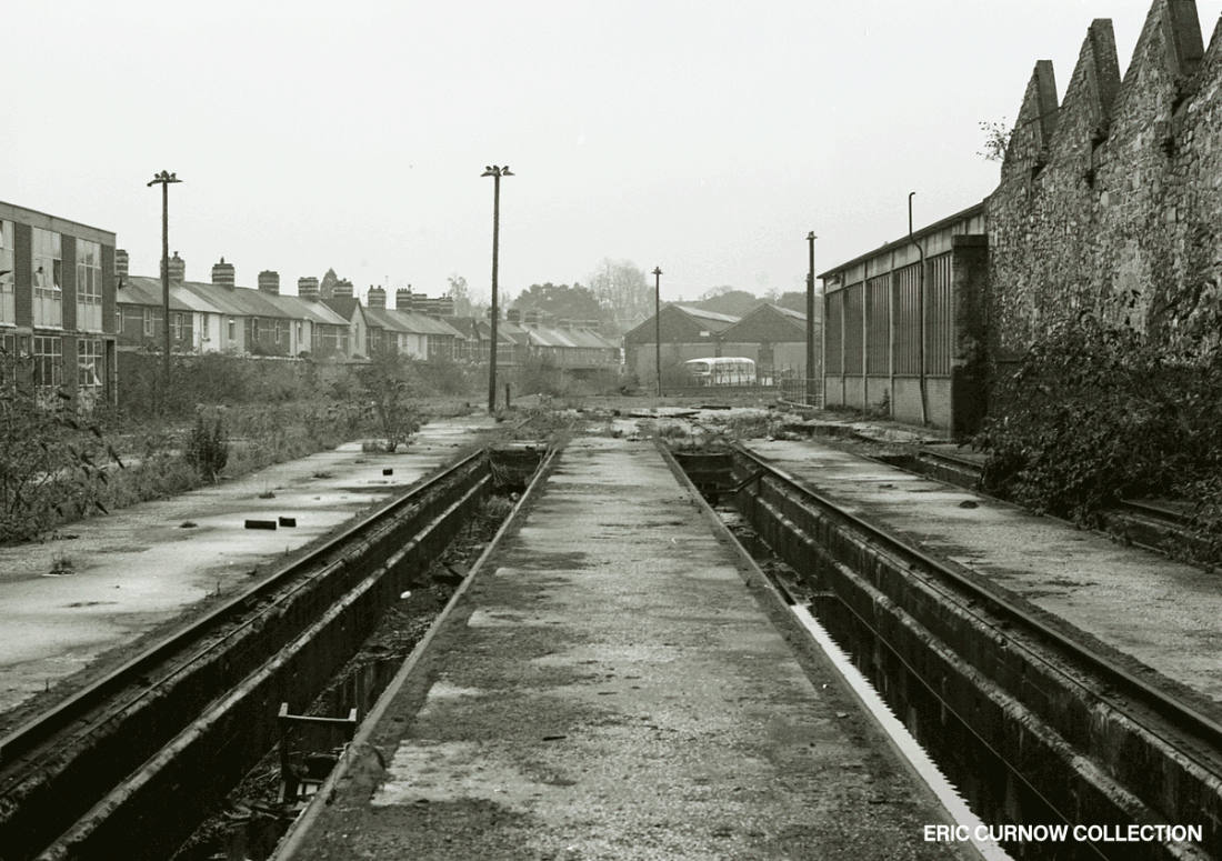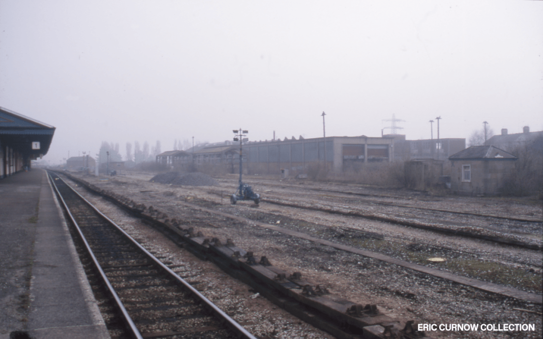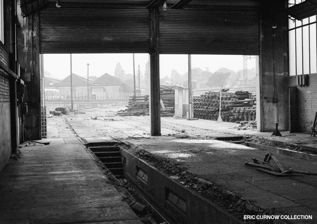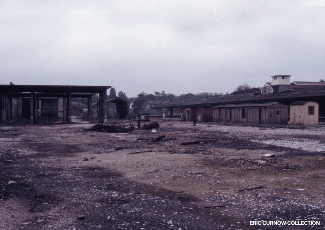 The western end of the depot showing sunken pits with rails removed and the roller doors raised high. Track panels lie stacked outside and low lighting poles are still profuse. The buildings in the distance are those of famous railway publishers ‘David & Charles’. 841116A02-NTA-D_SHD-VIS_W