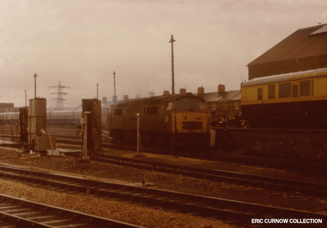 Before the line of railway workers dwellings, one of the few remaining Westerns, D1041 “WESTERN PRINCE” makes a foray westwards from Newton Abbot depot in very wet weather. A washing-plant is beside it on the right, and rakes of carriages behind in the yard. 7####GF01-NTA-D1041-LIGHT