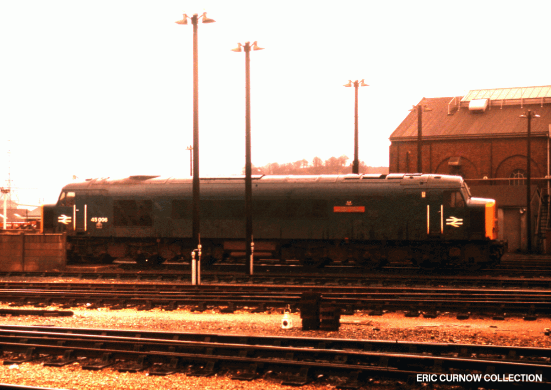 Amid lamp standards, in the storage sidings between Newton Abbot Station and the Works, Class 45 45006 ‘Honourable Artillery Company’ is seen parked on 22nd January 1977. With the demise of the diesel hydraulics, these locos became even more common. 77###AC01-NTA-45006-PARKD