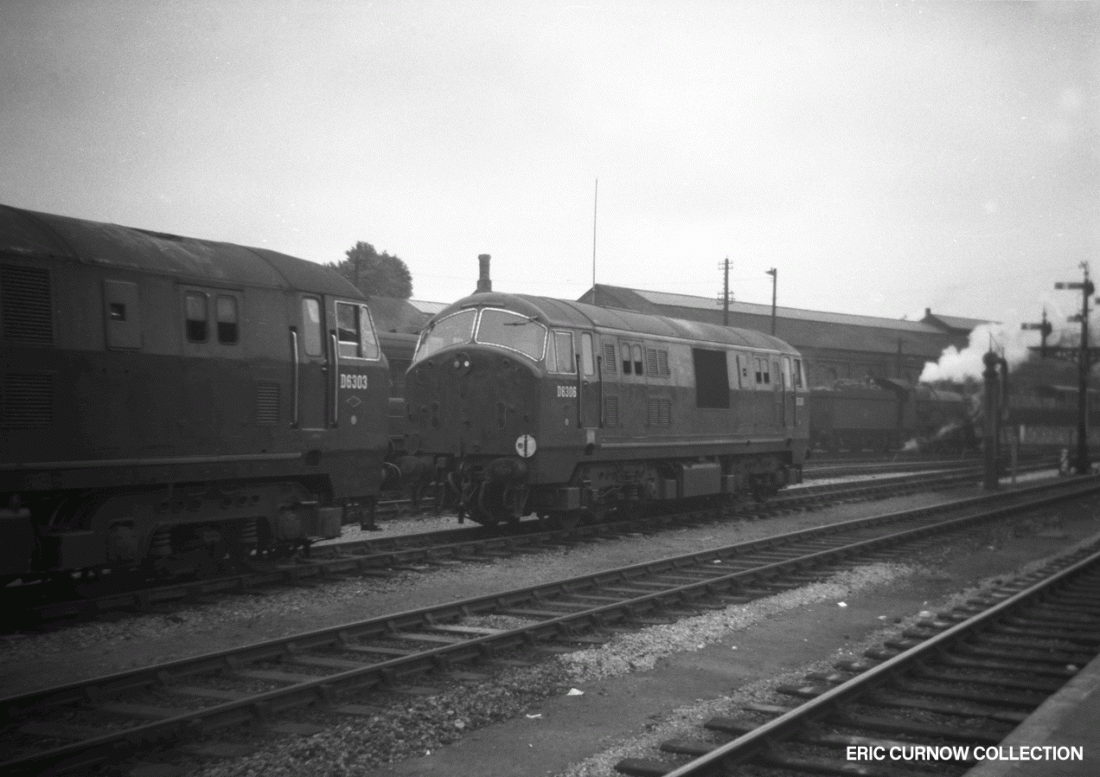 D63XXs awaiting duty are parked beside Newton Abbot depot in their early days, A loco from the prototype batch, D6303 is on the left with central louvres on its bodyside and D6306 of the production series has a mesh grating, improving engine room ventilation. It’s days now numbered, a ‘Castle’ class engine blows off steam in the background. 6####HO04-NTA-D63XX-PARKD