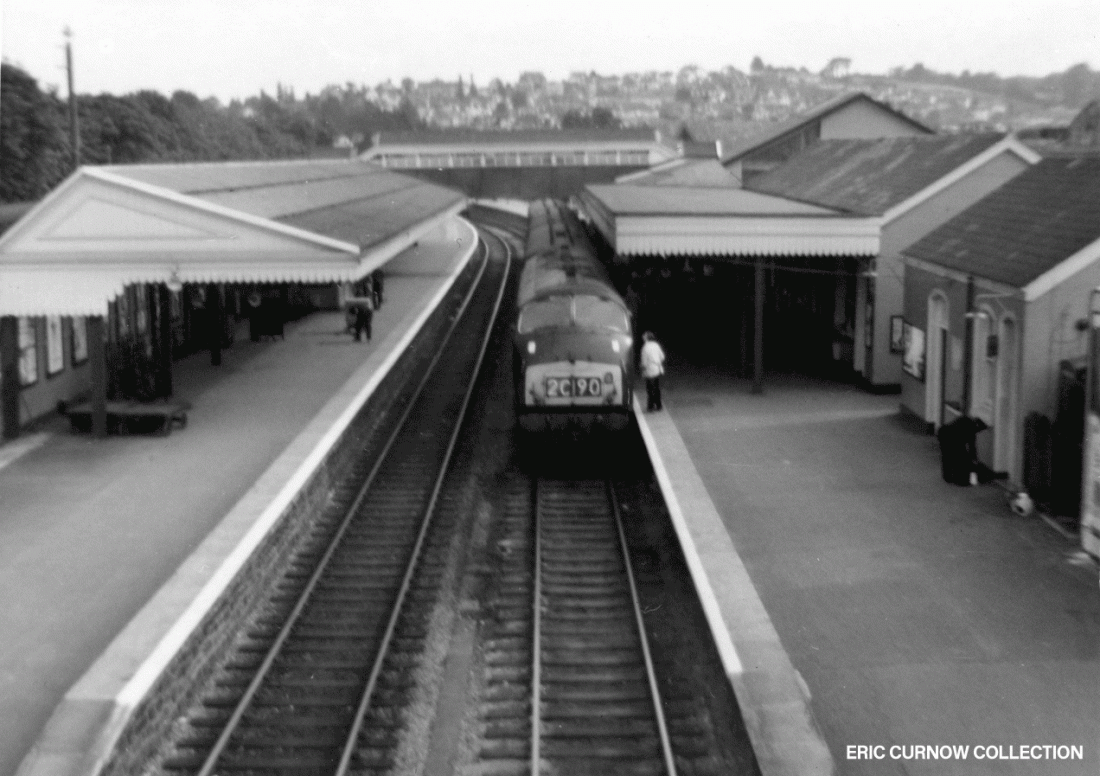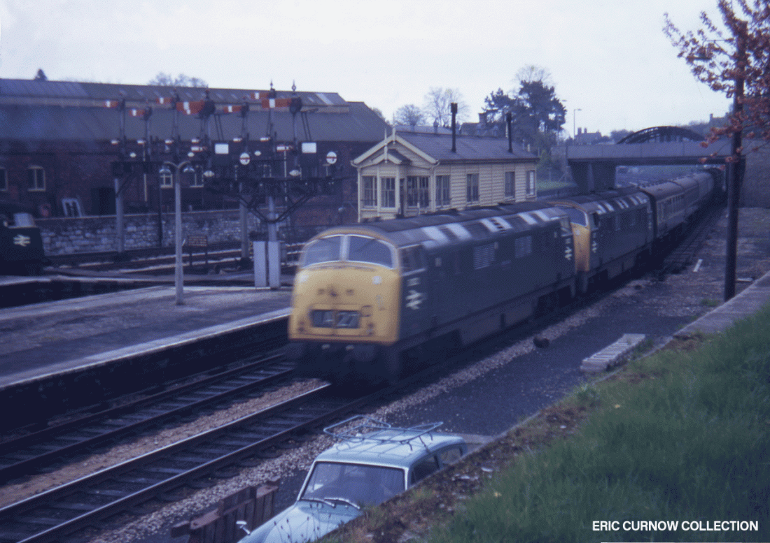 A large prairie tank simmers on the down line as D813 “DIADEM” enters Newton Abbot on the up with The Cornish Riviera Express – displaying a mere ‘A’ in the headcode boxes. Beside the train are many signal wires, indicating that quite strong pulls on the leavers in the Signal Box were necessary. 5####BZ01-NTA–D813-PAS_U