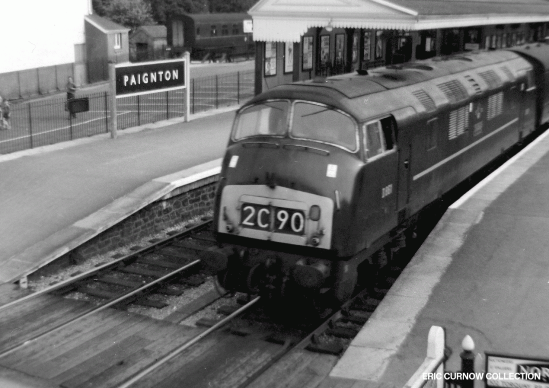 On the “down” 1B15 passenger service, D1016 pauses at a fairly deserted Newton Abbot on its way west. The huge awnings spread extensively across the platform areas, shading the loading of parcels from a BRUTE, while a DMU waits on the adjacent line. 750707A12-NTA-D1016-PAS_D