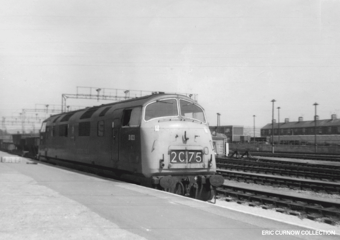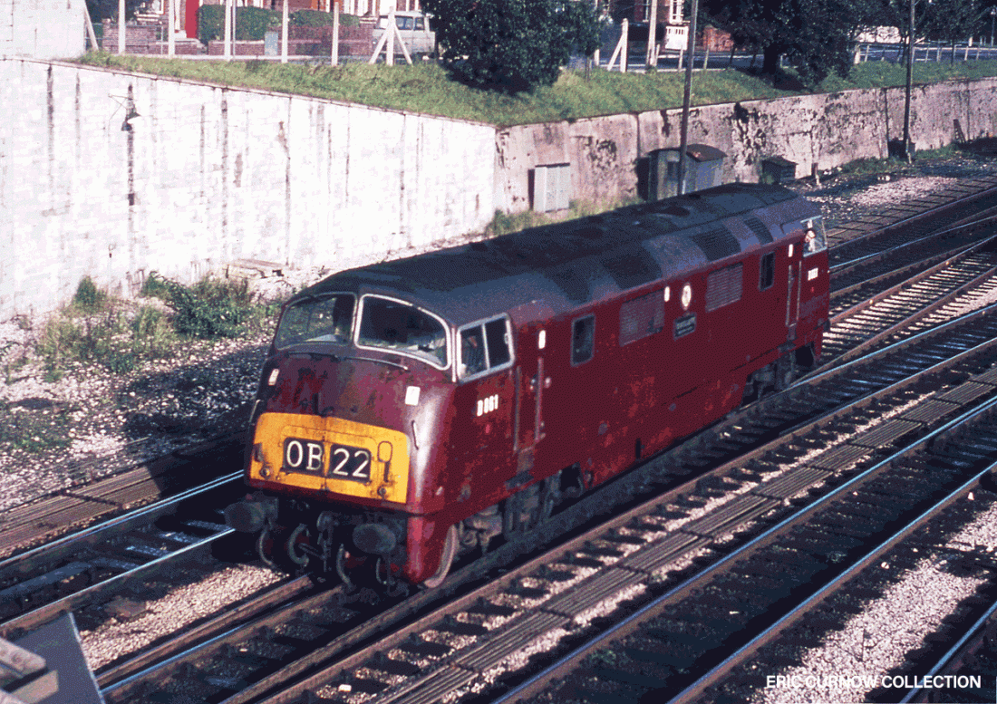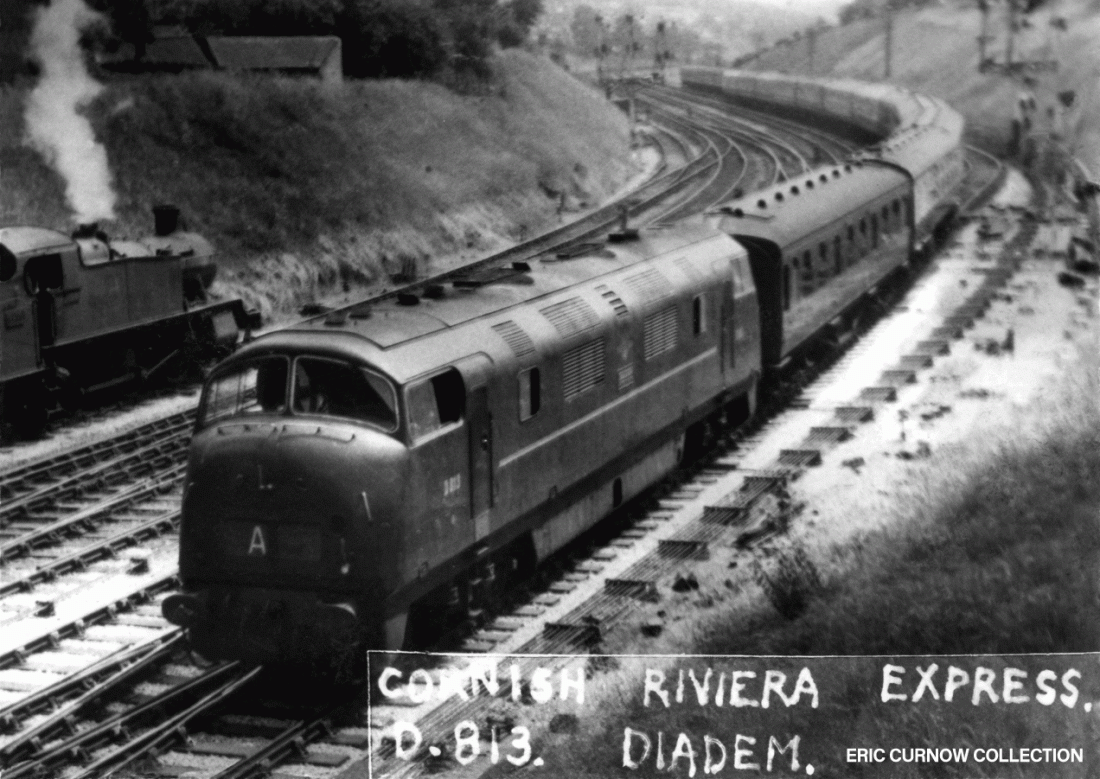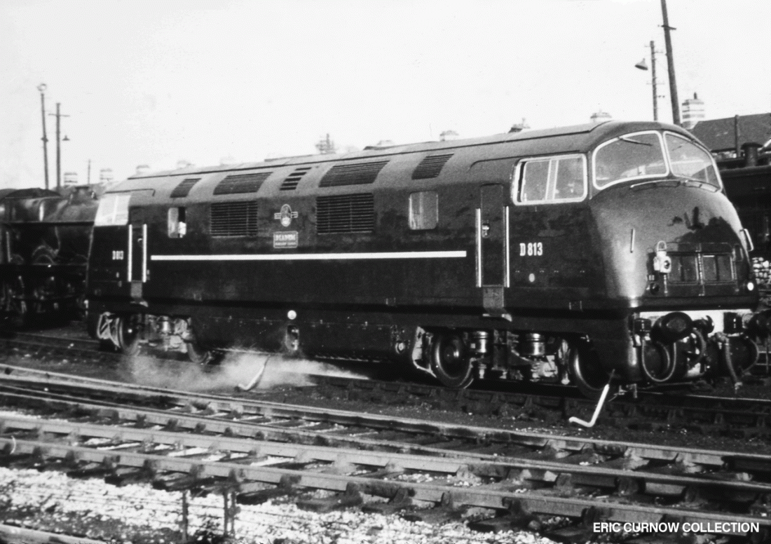 It is 25th January 1960, and new D813 “DIADEM” has arrived at Newton Abbot amid an environment of steam locos. Not yet “run in”, it has still to receive destination blinds, and has a red buffer beam and white builder’s plate – both colours fairly-soon abandoned. 600125A01-NTA-D813–PRK_D