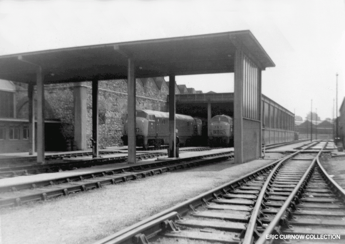 In high Summer of 1969, Warships wait next to the fueling bay on Newton Abbot shed. The simple elegance of the architecture blends well with the remaining walls of the old steam shed in local stone, and everything is commendably clean and tidy. 690723A01-NTA–D8XX-PARKD