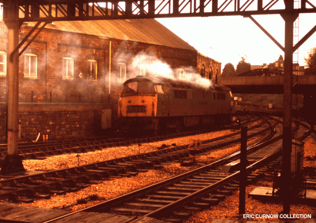 In poor condition, one of the few remaining Westerns, D1041 “WESTERN PRINCE” makes a run westwards with very smoky exhaust from Newton Abbot depot. One of the ex-GWR coaches from the raised area beside it has now gone, presumably into preservation. 7####ES01-NTA-D1041-LIGHT 7####ER01-NTA-D1041-LIGHT