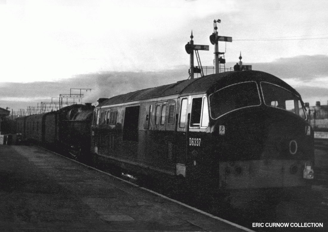 D6337 pilots ex-GWR 4964 at Newton Abbot station in1962, the diesel added to help haul the van train over the South Devon Banks westwards. Luggage waits on the platform; new lighting superstructure protrudes above the train; and railway workers housing is to the right. 62###AH01-NTA-LOCOS- GDS_D