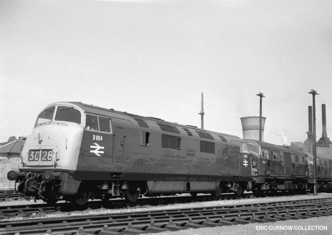 Warship D864 “ZAMBEZI” in May 1967 is parked with a pair of D63XXs towards the east end of Newton Abbot depot overlooked by the chimneys and cooling tower of the coal-fired power station. “ZAMBEZI” is in fine external condition with two logos per side. 6705##A01-NTA-D864–PARKD