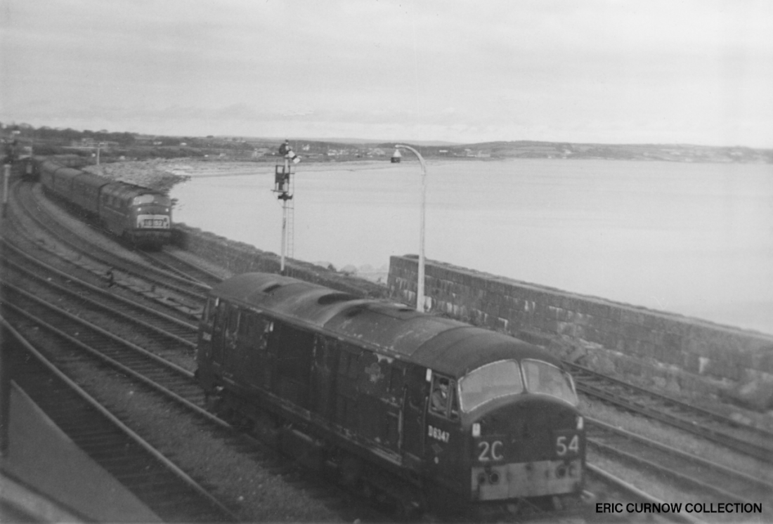 Rather distorted in the printing, the well-over 60′ long D600 waits before the signals, pictured from the station wall with St Michael’s Mount in the background in 1964. A totem sign and light standard identify the image, and a calm sea presents a peaceful evening scene. 6407##A03-PNZ–D600-LIG_U