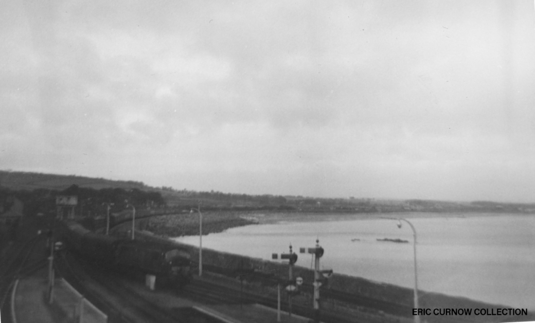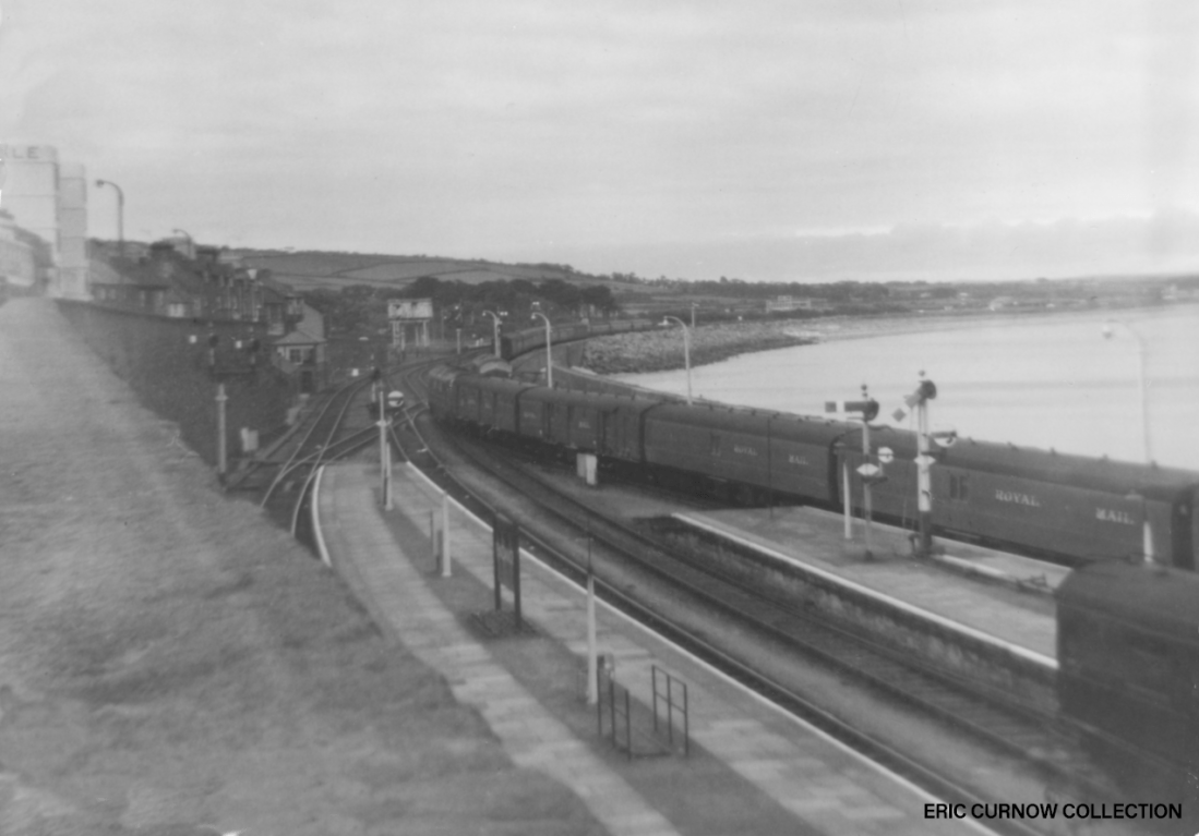 A ‘Warship’ takes out the Post Office red TPO in the darkening of the day, passing a D63XX parked in the sea siding and joining the main ‘up’ line. Maroon stock is parked in Platform 3, and the discrepancy in size of shunting signals on the right mast are clearly seen. 6407##A05-PNZ–D816-ROY_M