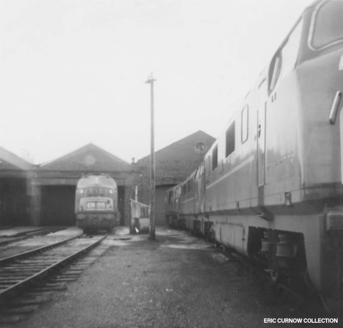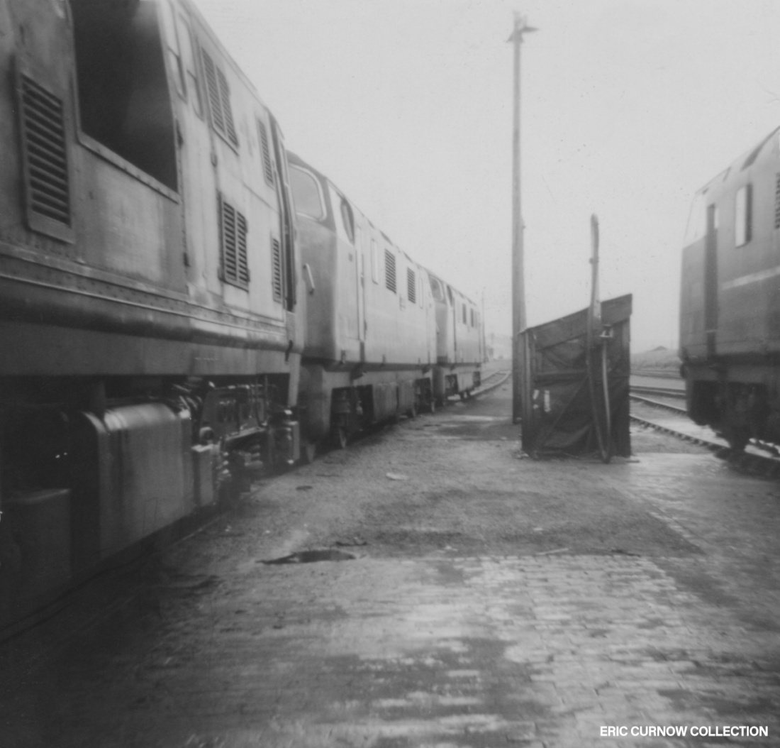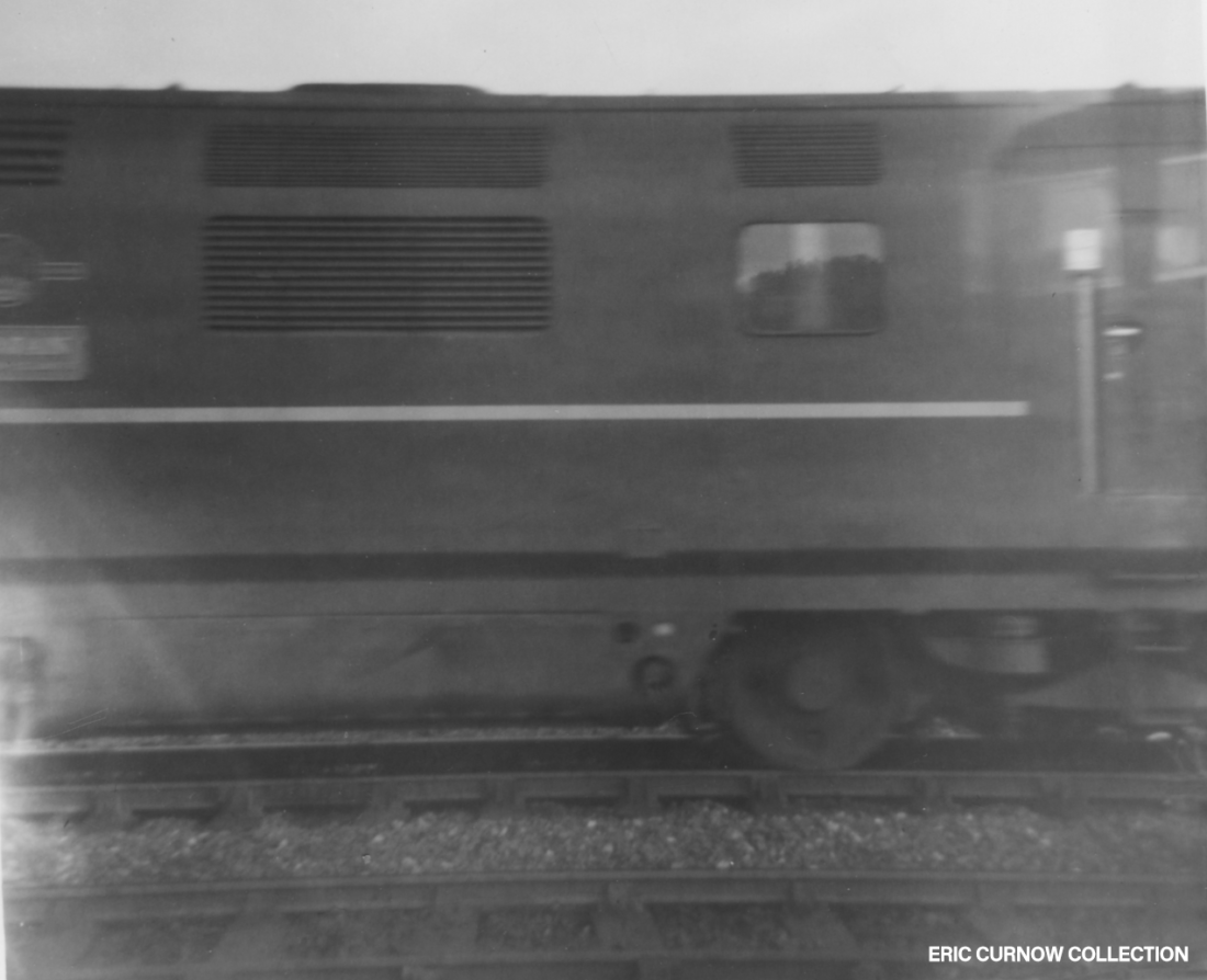 D816 “ECLIPSE” rumbles over the ‘Three Tunnels” bridge en route to the Sheds – its appearance a disgrace to British Rail. The louvre hatch without a bottom sill next to the white warning ‘Danger. Overhead live wires’ sign is where access to the tank for steam heating is made. 6407##A11-CHY–D816-LIG_Uc6