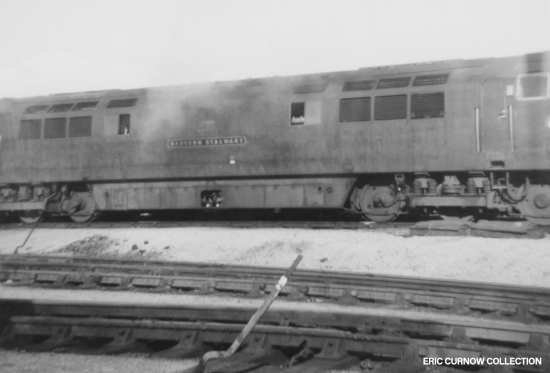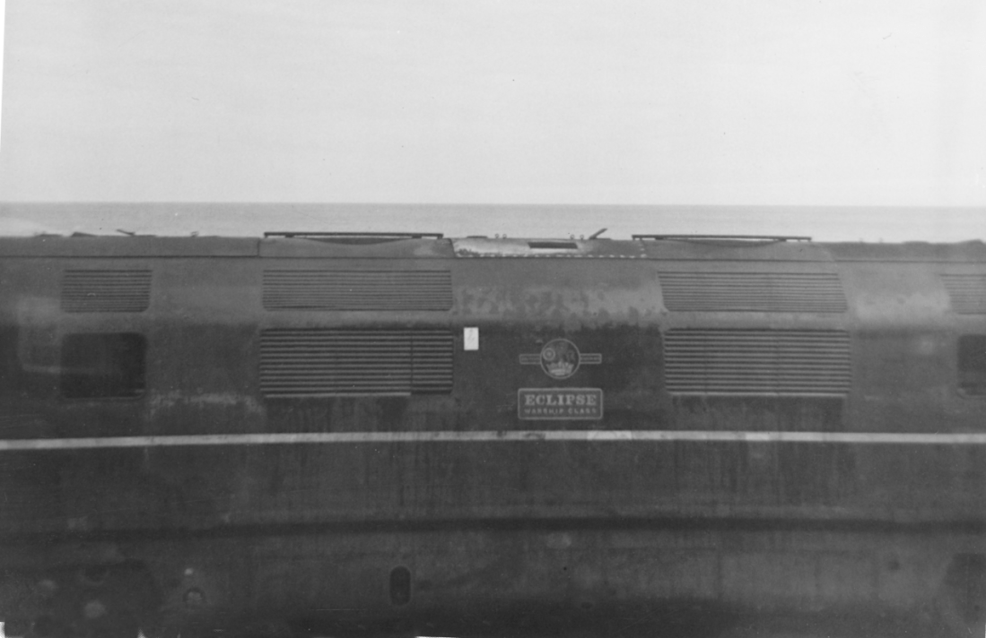 Warship class D816 “ECLIPSE” trundles between the station sidings and the Shed, its bodyside pitted with surface damage covering its original green livery. The sea wall behind has seen remedial attention, and sleepers awaiting recovery straddle the rails of the crane road. 6407##A04-PNZ–D816-LIGHT