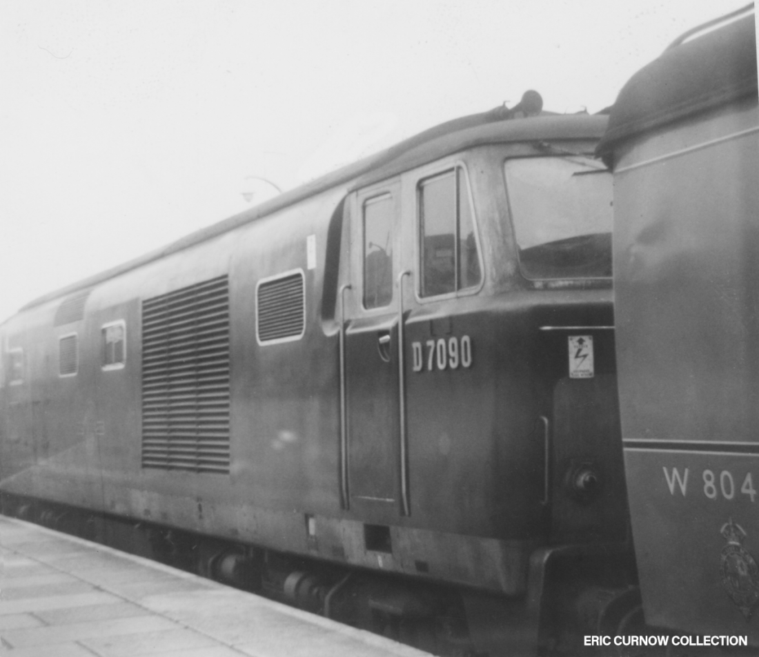 A rare picture of a ‘Hymek’ diesel at Penzance, at the head of the up Postal in September 1965 – the ubiquitous lamp standard curving above the sight as it has in so many other pictures of the station. It is in two-tone green livery – a bit grubby but basically presentable. 6509##A08-PNZ-D7090-ROY_M