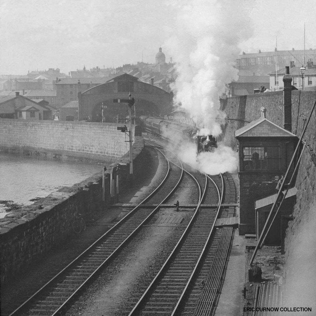 The “gem” of my collection so far, I think, as a double headed express pulls away from Penzance Station in the early 1900s with steam and smoke spreading everywhere. The original signal box – rarely seen in remaining photographs – is nearly opposite single line token equipment, and a brave man ascends a precarious ladder to the cable runs on the wall. 10####A02-PNZ-S_LCO-PAS_U