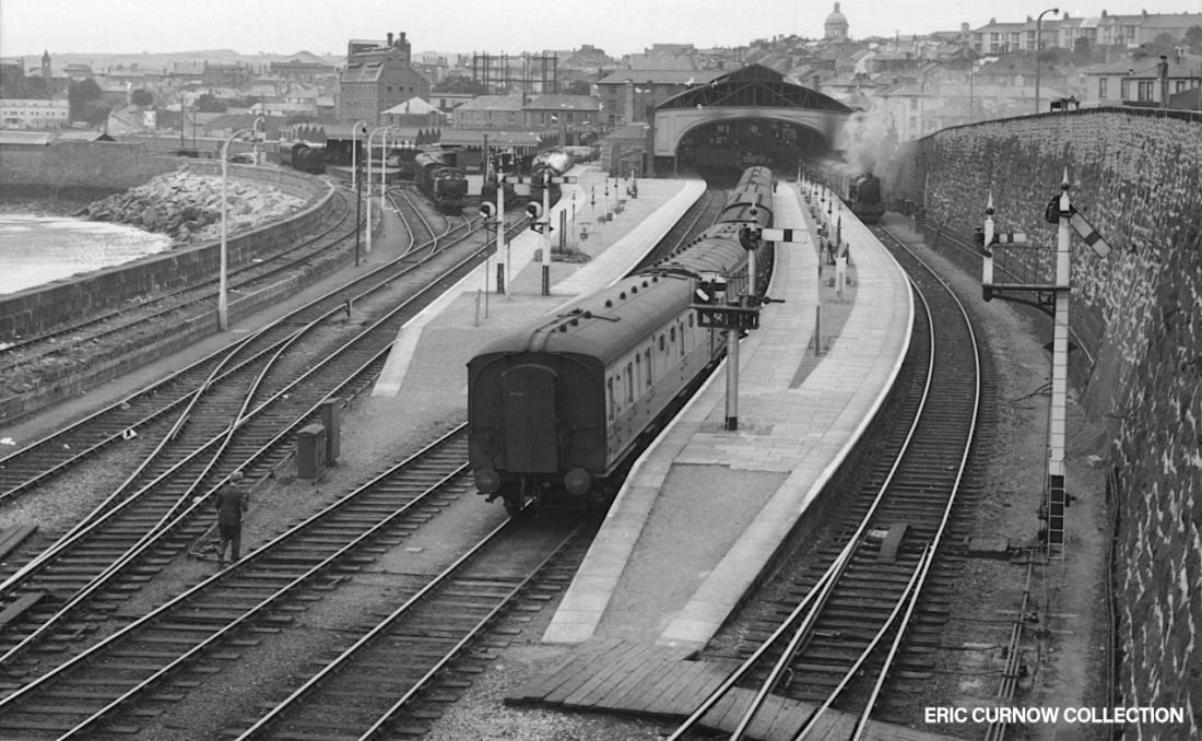 This view of Penzance Station shows a long rake of coaches on Platform 2; a ‘Castle’ with an up service on Platform 1; and miscellaneous vans in the Station Yard. The signals are still mainly of GWR wooden vintage, though the one nearest to the long rake has been changed for tubular steel and new concrete lamp standards have been erected along the sea wall. 5#####D01-PNZ-STATN-VI_SW