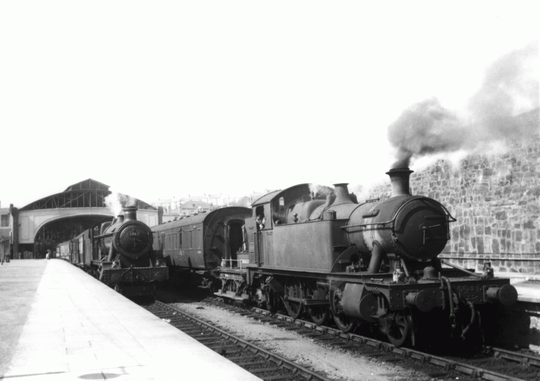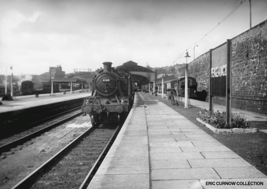 4148 waits at the front of a formation of carriages on Platform 2 of Penzance Station as a smaller sister engages itself similarly in Platform 1, with passengers coming and going from both. Smoke indicates a third loco is in the siding beside the goods platforms. 5#####A01-PNZ-s4148-PAS_U
