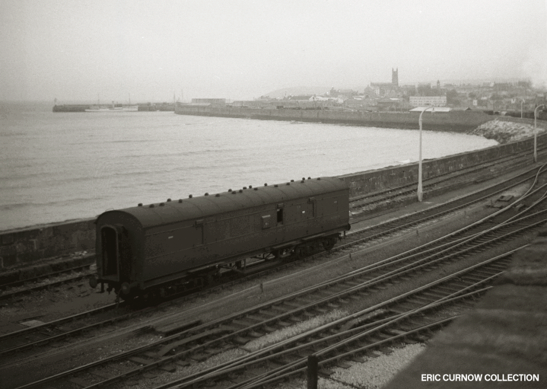 A peaceful scene from the redundant drinking fountain on top of the cliff at Penzance Station south west across to the harbour in 1954, as waves gently roll in. A parcels van, with a plethora of roof ventilators, is isolated on the Pilot’s siding. 54###AB01-PNZ-G_VAN-PARKD