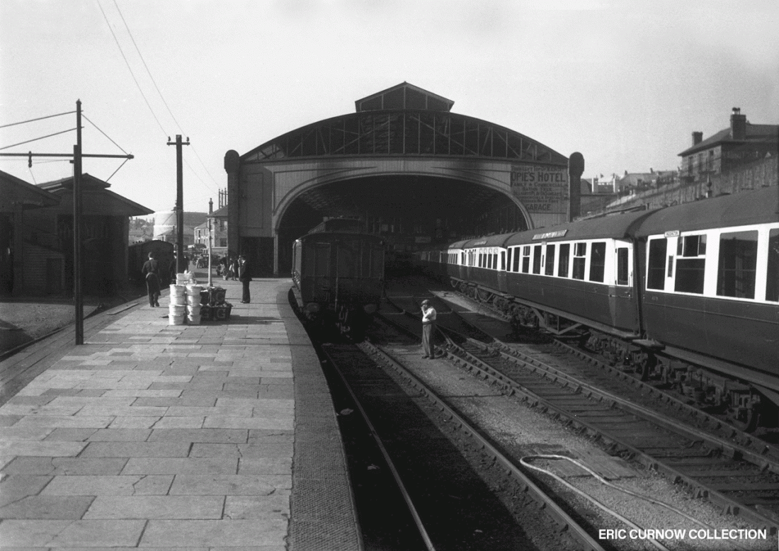 A rather damp and dismal day at Penzance Station in the late 1950s – where maroon coaching stock awaits use in most of the platforms. The rear of the set in the centre of the picture has a barier panel added to seal the corridor connection, but by the time I was trainspotting this practice had been generally discontinued. 5####CW01-PNZ-STATN-VI_SW