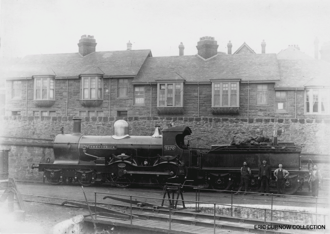 Four proud workmen pose before 4-4-0 No. 3270 “TREVITHICK”. The diagonal course of stone and cable follow the descent of the road behind, and the handles on the turntable might be for “fine tuning” if the winding doesn’t match up well enough. #####AQ01-PNZ-s3270-TURNT